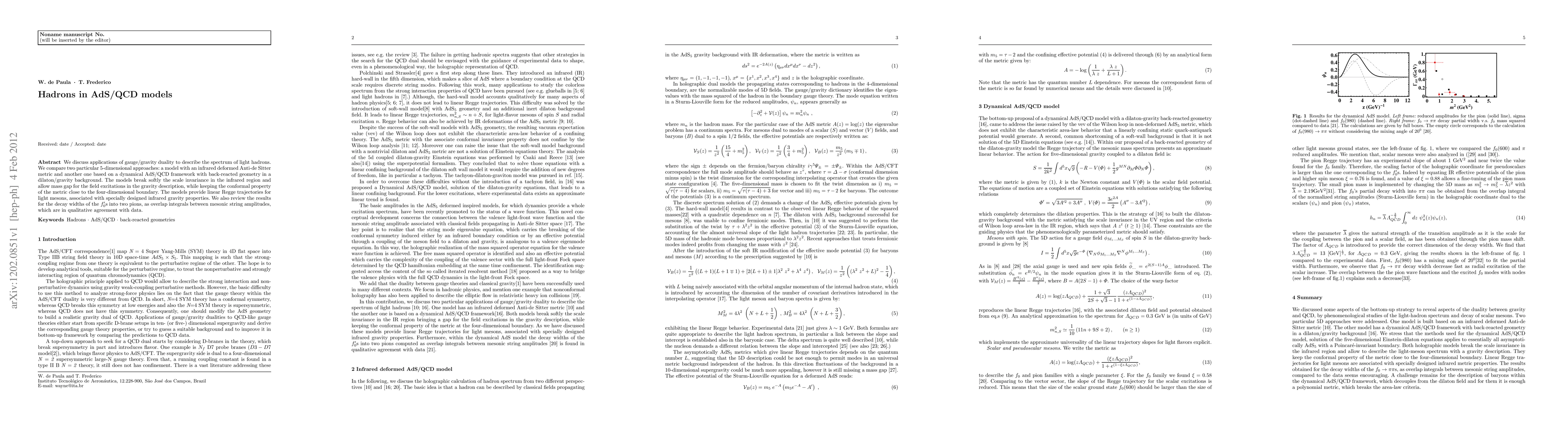 We discuss applications of gauge/gravity duality to describe the spectrum of light hadrons. We compare two particular 5-dimensional approaches: a model with an infrared deformed Anti-de Sitter metric and another one based on a dynamical AdS/QCD framework with back-reacted geometry in a dilaton/gravity background. The models break softly the scale invariance in the infrared region and allow mass gap for the field excitations in the gravity description, while keeping the conformal property of the metric close to the four-dimensional boundary. The models provide linear Regge trajectories for light mesons, associated with specially designed infrared gravity properties. We also review the results for the decay widths of the f0's into two pions, as overlap integrals between mesonic string amplitudes, which are in qualitative agreement with data.