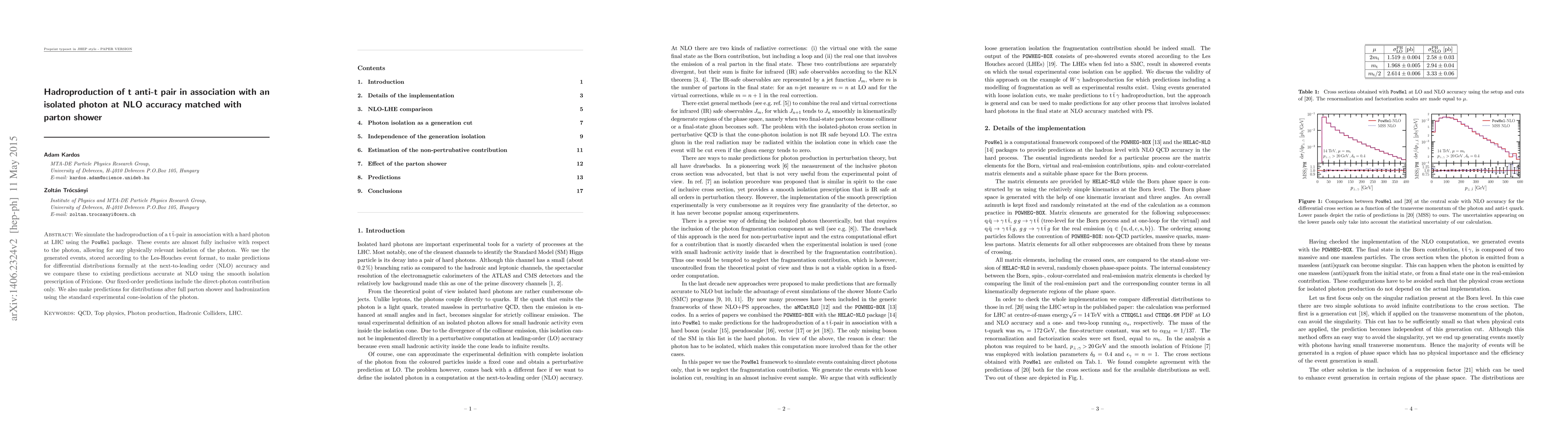 We simulate the hadroproduction of a t anti-t pair in association with a hard photon at LHC using the PowHel package. These events are almost fully inclusive with respect to the photon, allowing for any physically relevant isolation of the photon. We use the generated events, stored according to the Les-Houches event format, to make predictions for differential distributions formally at the next-to-leading order (NLO) accuracy and we compare these to existing predictions accurate at NLO using the smooth isolation prescription of Frixione. We also make predictions for distributions after full parton shower and hadronization using the standard experimental cone-isolation of the photon.
