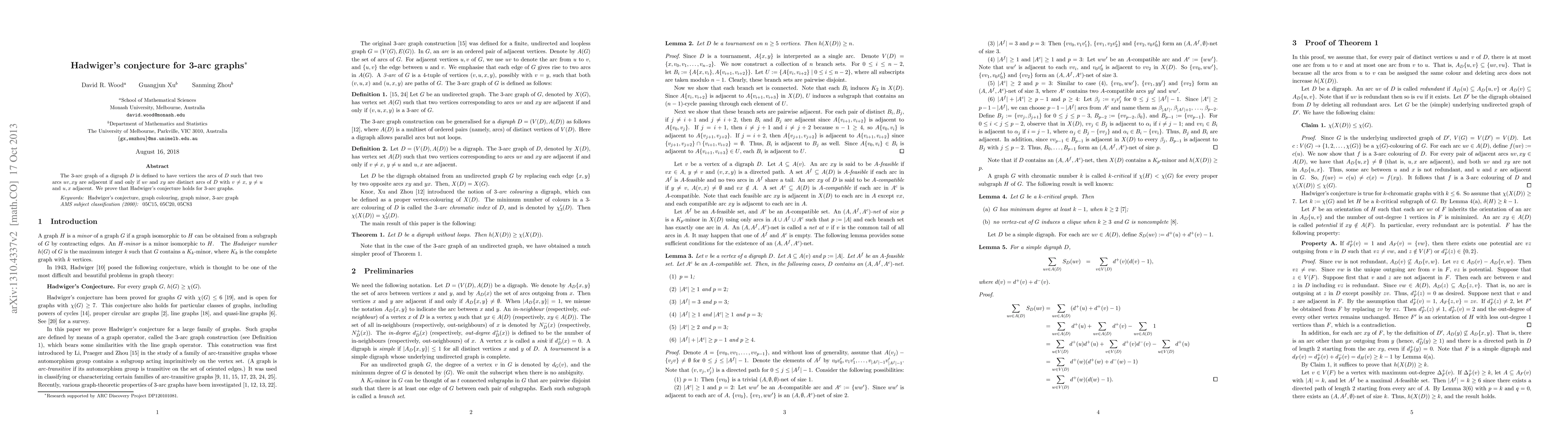 Hadwiger's conjecture for 3-arc graphs has been proven, confirming the conjecture for these graphs where vertices represent arcs and edges connect arcs that share an adjacency in the original digraph. This result extends the validity of Hadwiger's conjecture to a new class of graphs.