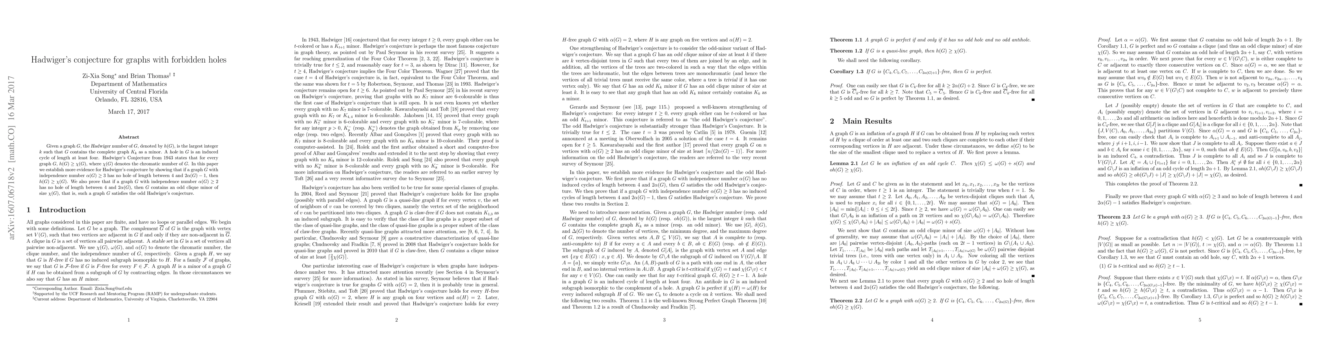 This paper provides evidence supporting Hadwiger's conjecture by demonstrating that graphs without certain hole lengths and with high independence numbers have Hadwiger numbers at least equal to their chromatic numbers. Additionally, it proves that such graphs also satisfy the odd Hadwiger's conjecture.