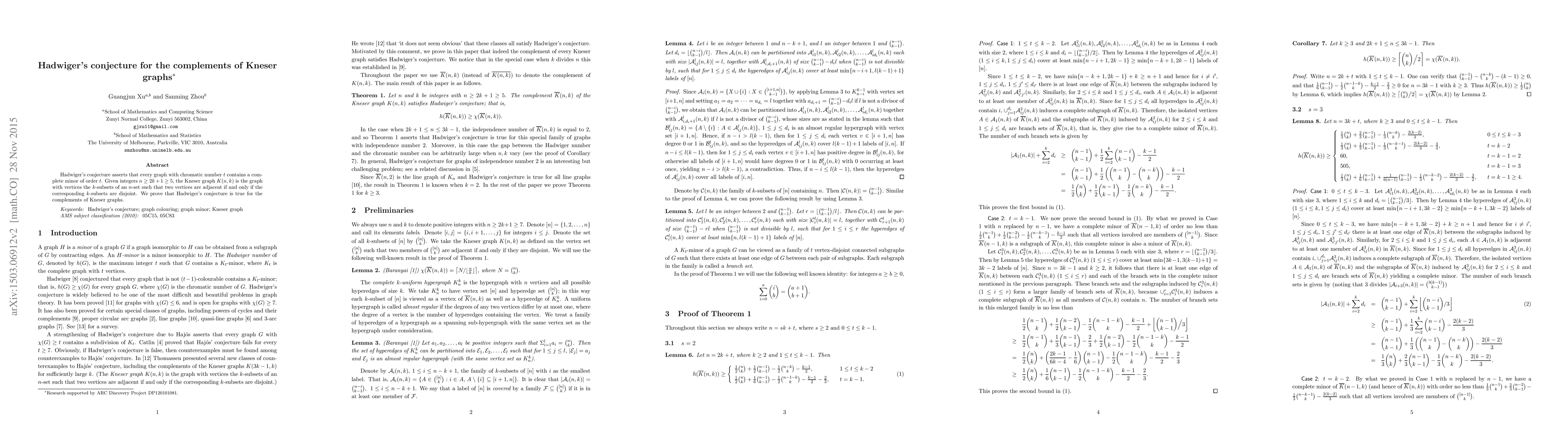 This research contributes to the field of graph theory by proving Hadwiger's conjecture for a new class of graphs (complements of Kneser graphs), advancing our understanding of graph minors and chromatic numbers.