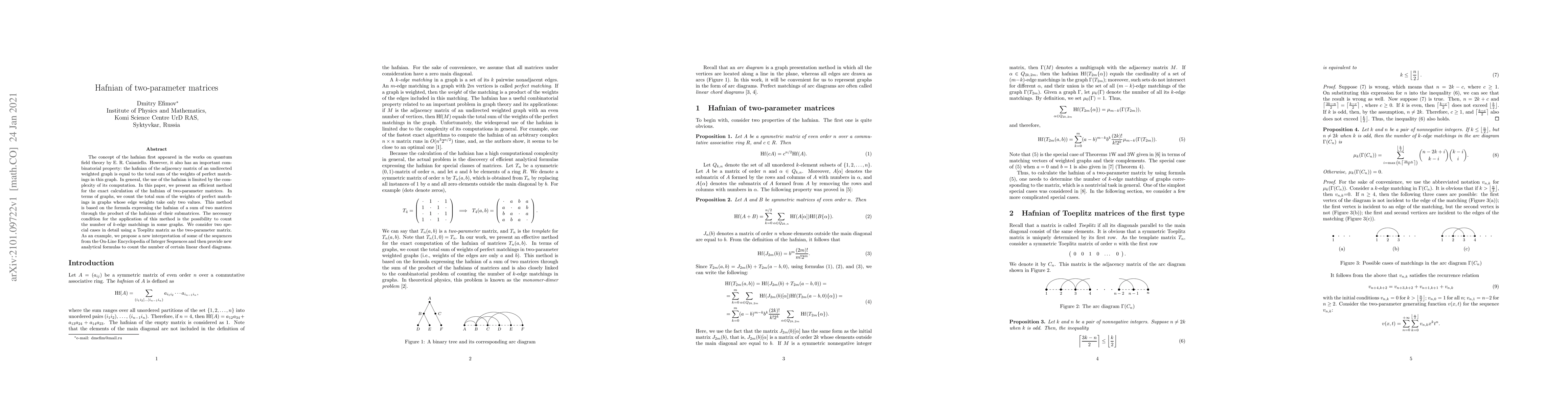 This paper introduces an efficient method for computing the hafnian of two-parameter matrices, which is crucial for counting perfect matchings in graphs with binary edge weights. The method leverages a formula relating the hafnian of matrix sums to the product of hafnians of submatrices, offering new insights into sequences from the On-Line Encyclopedia of Integer Sequences and linear chord diagrams.