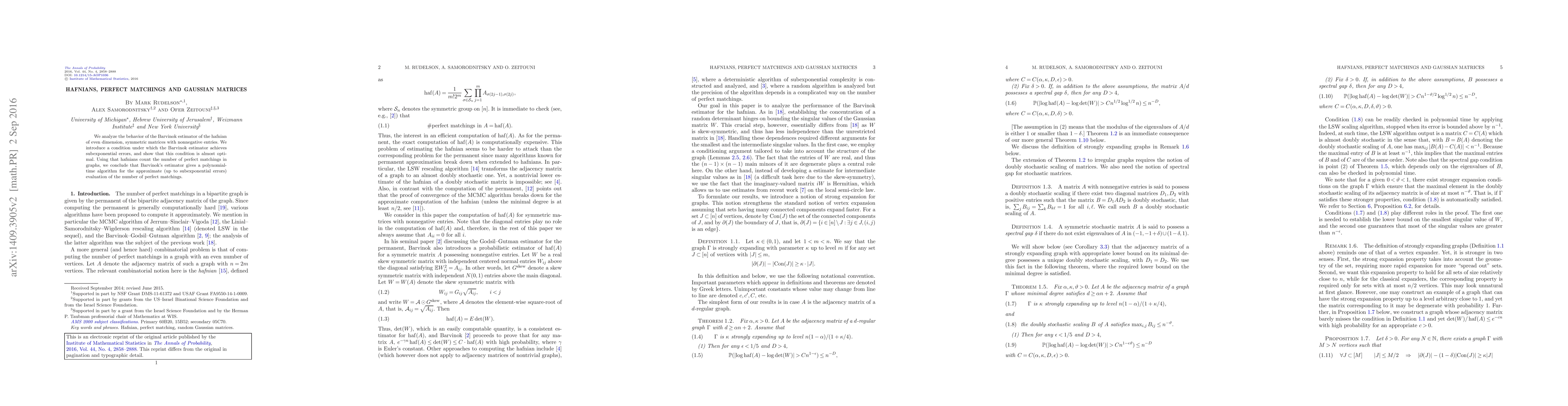 This paper investigates the Barvinok estimator for hafnians of symmetric, nonnegative matrices, demonstrating its subexponential error under specific conditions, and concludes that it provides a polynomial-time approximation algorithm for counting perfect matchings in graphs.
