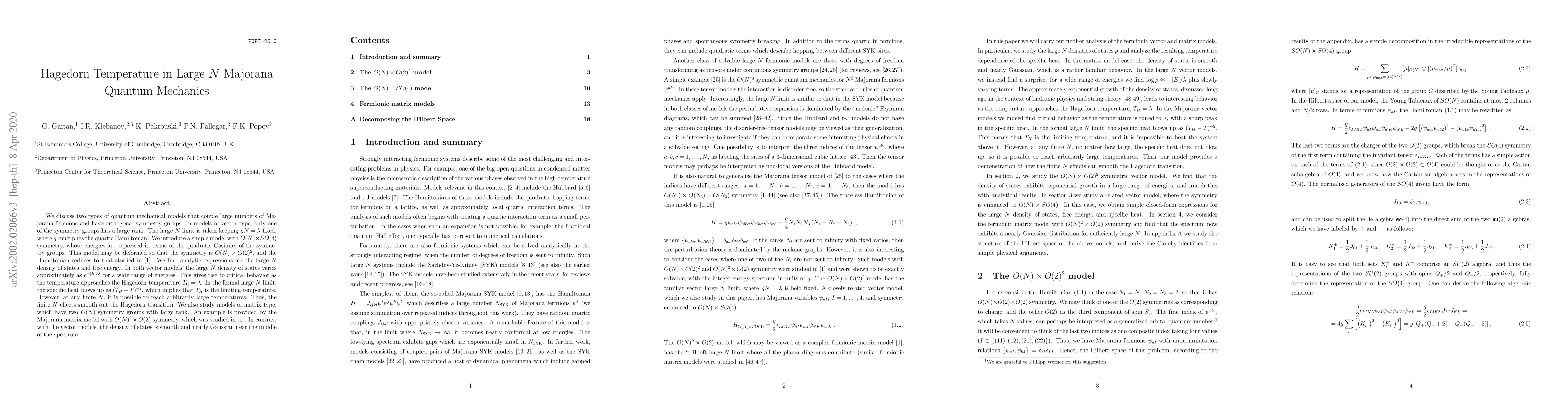 We discuss two types of quantum mechanical models that couple large numbers of Majorana fermions and have orthogonal symmetry groups. In models of vector type, only one of the symmetry groups has a large rank. The large $N$ limit is taken keeping $gN=\lambda$ fixed, where $g$ multiplies the quartic Hamiltonian. We introduce a simple model with $O(N)\times SO(4)$ symmetry, whose energies are expressed in terms of the quadratic Casimirs of the symmetry groups. This model may be deformed so that the symmetry is $O(N)\times O(2)^2$, and the Hamiltonian reduces to that studied in arXiv:1802.10263. We find analytic expressions for the large $N$ density of states and free energy. In both vector models, the large $N$ density of states varies approximately as $e^{-|E|/\lambda}$ for a wide range of energies. This gives rise to critical behavior as the temperature approaches the Hagedorn temperature $T_{\rm H} = \lambda$. In the formal large $N$ limit, the specific heat blows up as $(T_H- T)^{-2}$, which implies that $T_H$ is the limiting temperature. However, at any finite $N$, it is possible to reach arbitrarily large temperatures. Thus, the finite $N$ effects smooth out the Hagedorn transition. We also study models of matrix type, which have two $O(N)$ symmetry groups with large rank. An example is provided by the Majorana matrix model with $O(N)^2\times O(2)$ symmetry, which was studied in arXiv:1802.10263. In contrast with the vector models, the density of states is smooth and nearly Gaussian near the middle of the spectrum.