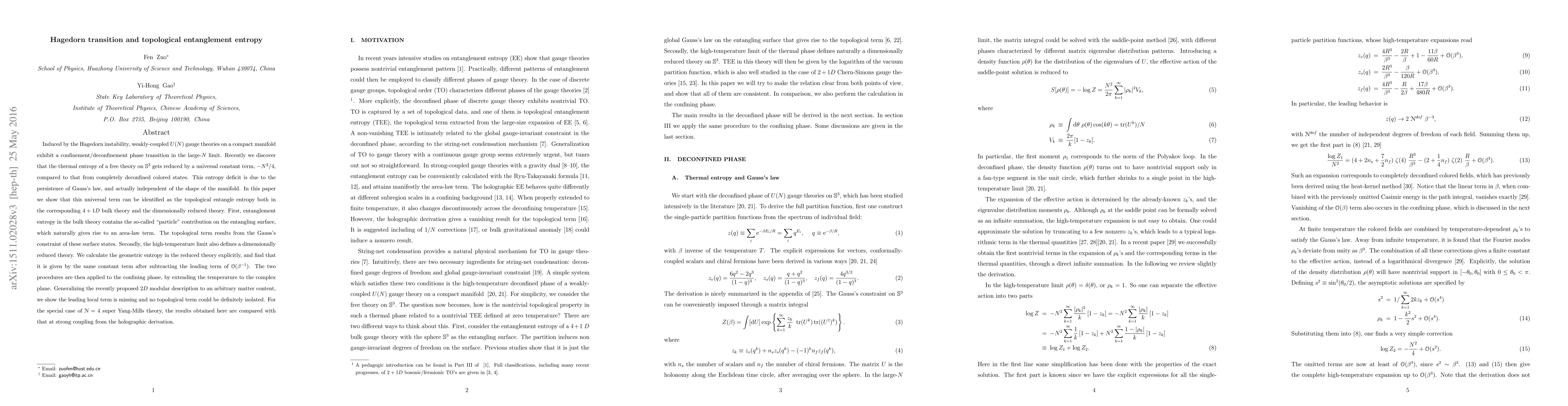Induced by the Hagedorn instability, weakly-coupled $U(N)$ gauge theories on a compact manifold exhibit a confinement/deconfinement phase transition in the large-$N$ limit. Recently we discover that the thermal entropy of a free theory on $\mathbb{S}^3$ gets reduced by a universal constant term, $-N^2/4$, compared to that from completely deconfined colored states. This entropy deficit is due to the persistence of Gauss's law, and actually independent of the shape of the manifold. In this paper we show that this universal term can be identified as the topological entangle entropy both in the corresponding $4+1 D$ bulk theory and the dimensionally reduced theory. First, entanglement entropy in the bulk theory contains the so-called "particle" contribution on the entangling surface, which naturally gives rise to an area-law term. The topological term results from the Gauss's constraint of these surface states. Secondly, the high-temperature limit also defines a dimensionally reduced theory. We calculate the geometric entropy in the reduced theory explicitly, and find that it is given by the same constant term after subtracting the leading term of ${\mathcal O}(\beta^{-1})$. The two procedures are then applied to the confining phase, by extending the temperature to the complex plane. Generalizing the recently proposed $2D$ modular description to an arbitrary matter content, we show the leading local term is missing and no topological term could be definitely isolated. For the special case of ${\mathcal N}=4$ super Yang-Mills theory, the results obtained here are compared with that at strong coupling from the holographic derivation.