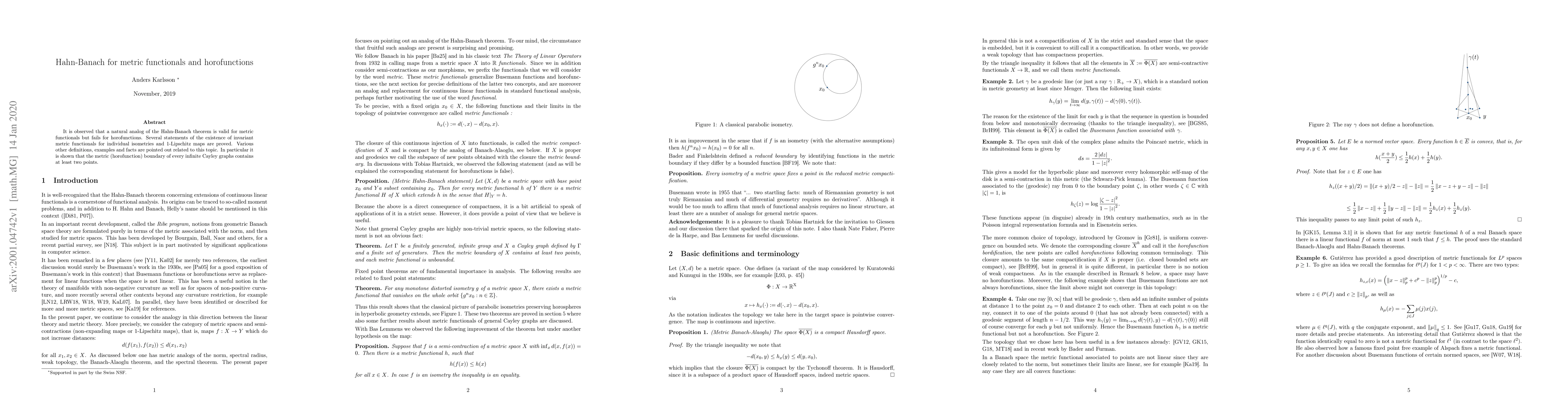 It is observed that a natural analog of the Hahn-Banach theorem is valid for metric functionals but fails for horofunctions. Several statements of the existence of invariant metric functionals for individual isometries and 1-Lipschitz maps are proved. Various other definitions, examples and facts are pointed out related to this topic. In particular it is shown that the metric (horofunction) boundary of every infinite Cayley graphs contains at least two points.