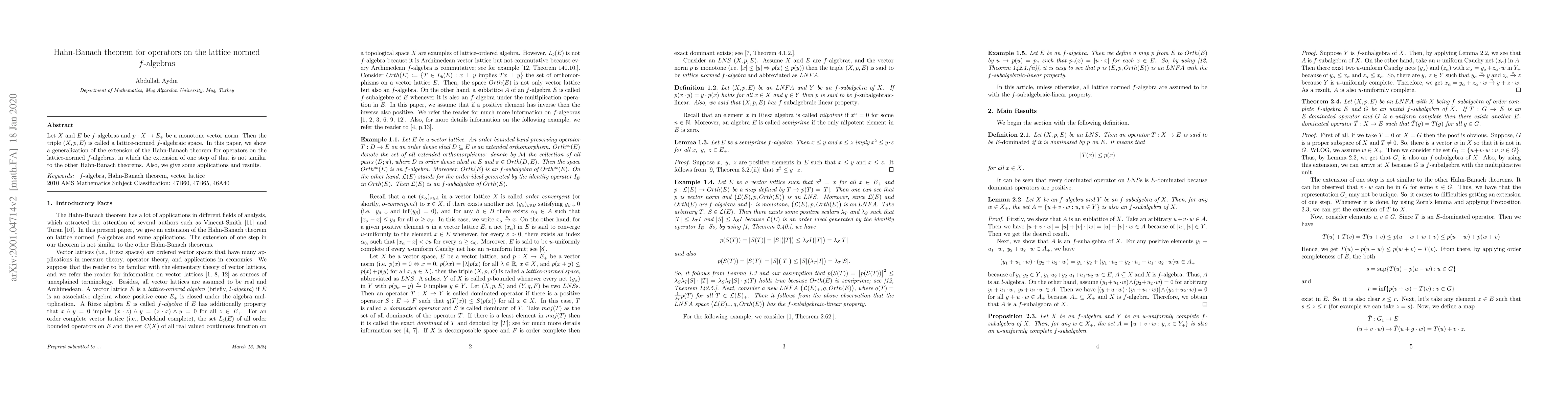 Let $X$ and $E$ be $f$-algebras and $p:X \to E_+$ be a monotone vector norm. Then the triple $(X,p,E)$ is called a lattice-normed $f$-algebraic space. In this paper, we show a generalization of the extension of the Hahn-Banach theorem for operators on the lattice-normed $f$-algebras, in which the extension of one step of that is not similar to the other Hahn-Banach theorems. Also, we give some applications and results.
