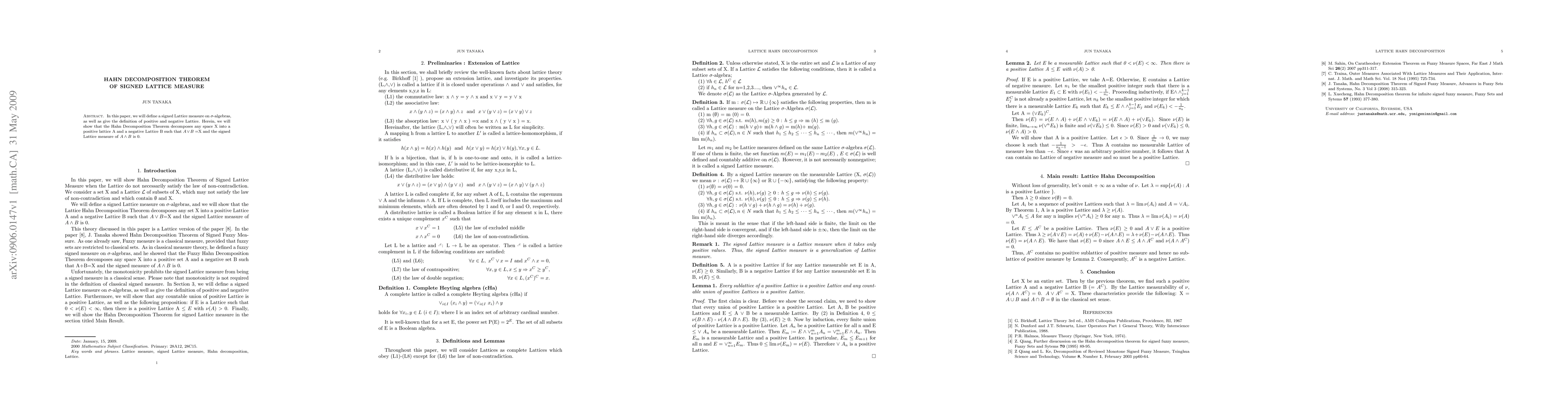 This paper defines a signed lattice measure on $\sigma$-algebras and presents the Hahn Decomposition Theorem, which splits any space X into a positive lattice A and a negative lattice B, satisfying $A \vee B = X$ and the signed lattice measure of $A \wedge B$ is 0.