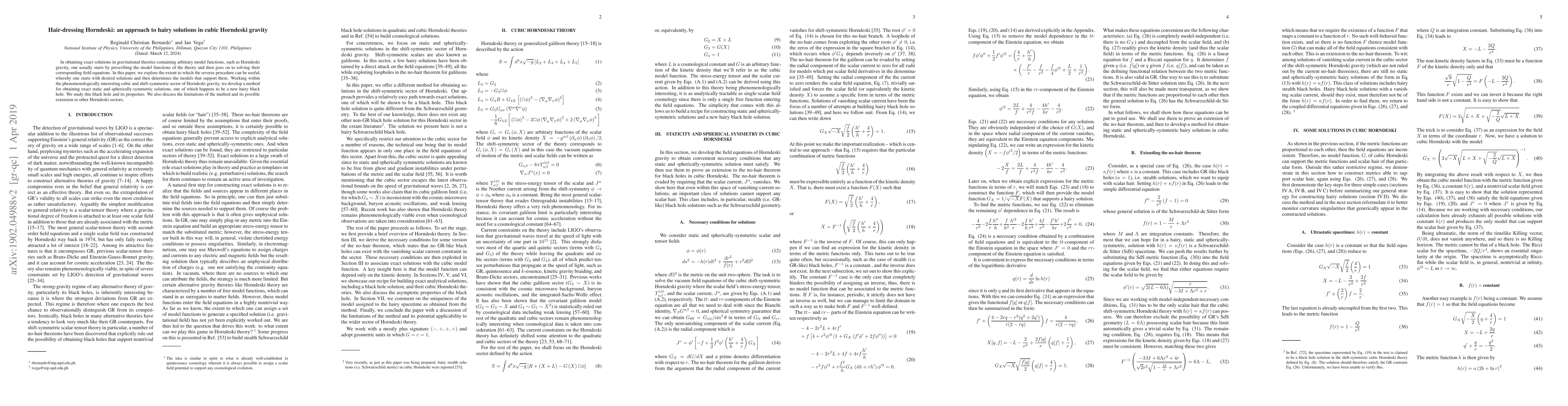 This paper develops a method to derive exact static and spherically-symmetric solutions in the cubic, shift-symmetric sector of Horndeski gravity, starting with desired solutions rather than prescribed model functions. It presents a new hairy black hole solution and discusses its properties, along with the method's limitations and potential extensions.