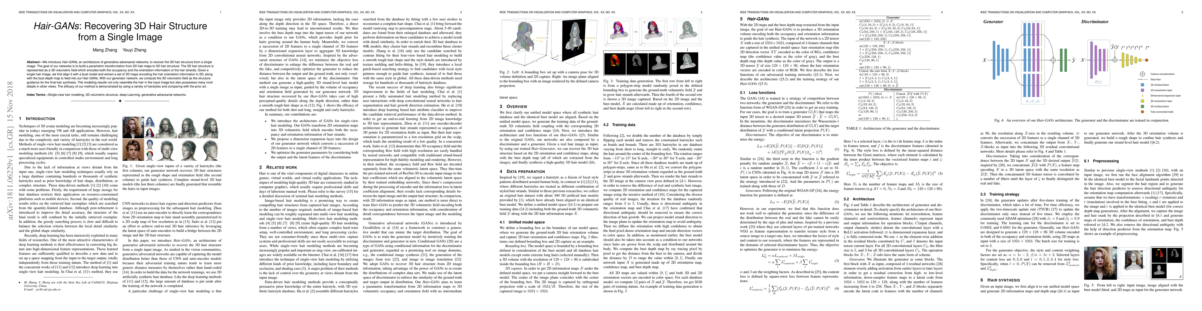We introduce Hair-GANs, an architecture of generative adversarial networks, to recover the 3D hair structure from a single image. The goal of our networks is to build a parametric transformation from 2D hair maps to 3D hair structure. The 3D hair structure is represented as a 3D volumetric field which encodes both the occupancy and the orientation information of the hair strands. Given a single hair image, we first align it with a bust model and extract a set of 2D maps encoding the hair orientation information in 2D, along with the bust depth map to feed into our Hair-GANs. With our generator network, we compute the 3D volumetric field as the structure guidance for the final hair synthesis. The modeling results not only resemble the hair in the input image but also possesses many vivid details in other views. The efficacy of our method is demonstrated by using a variety of hairstyles and comparing with the prior art.