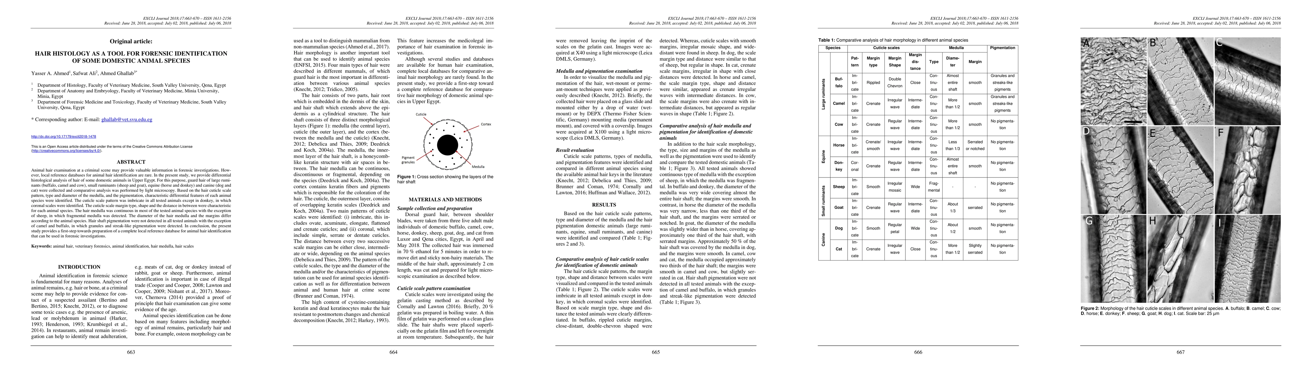 Animal hair examination at a criminal scene may provide valuable information in forensic investigations. However, local reference databases for animal hair identification are rare. In the present study, we provide differential histological analysis of hair of some domestic animals in Upper Egypt. For this purpose, guard hair of large ruminants (buffalo, camel and cow), small ruminants (sheep and goat), equine (horse and donkey) and canine (dog and cat) were collected and comparative analysis was performed by light microscopy. Based on the hair cuticle scale pattern, type and diameter of the medulla, and the pigmentation, characteristic differential features of each animal species were identified. The cuticle scale pattern was imbricate in all tested animals except in donkey, in which coronal scales were identified. The cuticle scale margin type, shape and the distance in between were characteristic for each animal species. The hair medulla was continuous in most of the tested animal species with the exception of sheep, in which fragmental medulla was detected. The diameter of the hair medulla and the margins differ according to the animal species. Hair shaft pigmentation were not detected in all tested animals with the exception of camel and buffalo, in which granules and streak-like pigmentation were detected. In conclusion, the present study provides a first-step towards preparation of a complete local reference database for animal hair identification that can be used in forensic investigations.