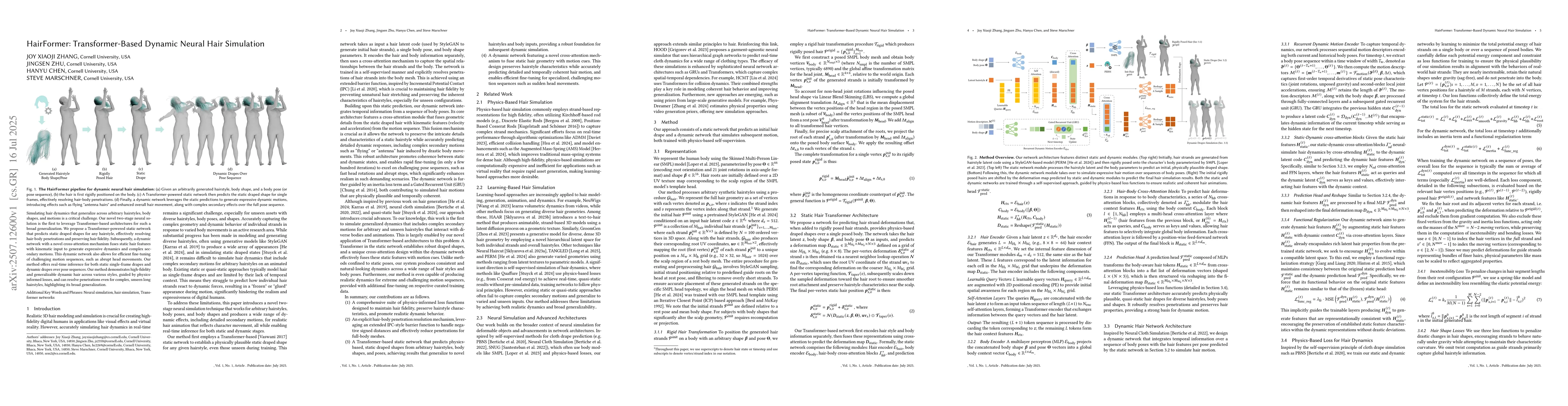 The paper introduces HairFormer, a Transformer-based neural network for simulating realistic hair dynamics. It consists of a static network predicting draped hair shapes and a dynamic network generating expressive hair movements, both allowing for real-time inference. HairFormer generalizes well across various hairstyles, body shapes, and motions, resolving penetration issues and enabling efficient fine-tuning of complex motion sequences.