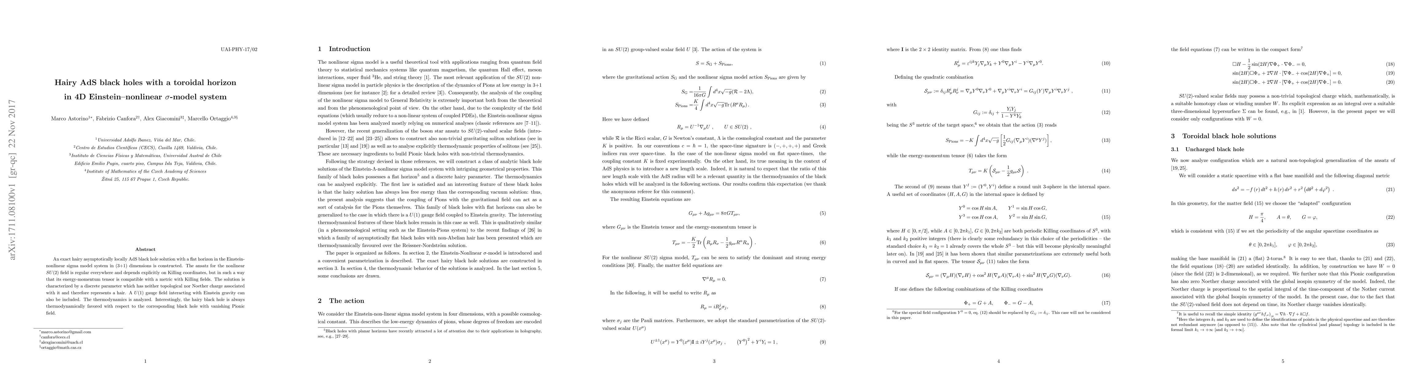 An exact hairy asymptotically locally AdS black hole solution with a flat horizon in the Einstein-nonlinear sigma model system in (3+1) dimensions is constructed. The ansatz for the nonlinear $SU(2)$ field is regular everywhere and depends explicitly on Killing coordinates, but in such a way that its energy-momentum tensor is compatible with a metric with Killing fields. The solution is characterized by a discrete parameter which has neither topological nor Noether charge associated with it and therefore represents a hair. A $U(1)$ gauge field interacting with Einstein gravity can also be included. The thermodynamics is analyzed. Interestingly, the hairy black hole is always thermodynamically favored with respect to the corresponding black hole with vanishing Pionic field.