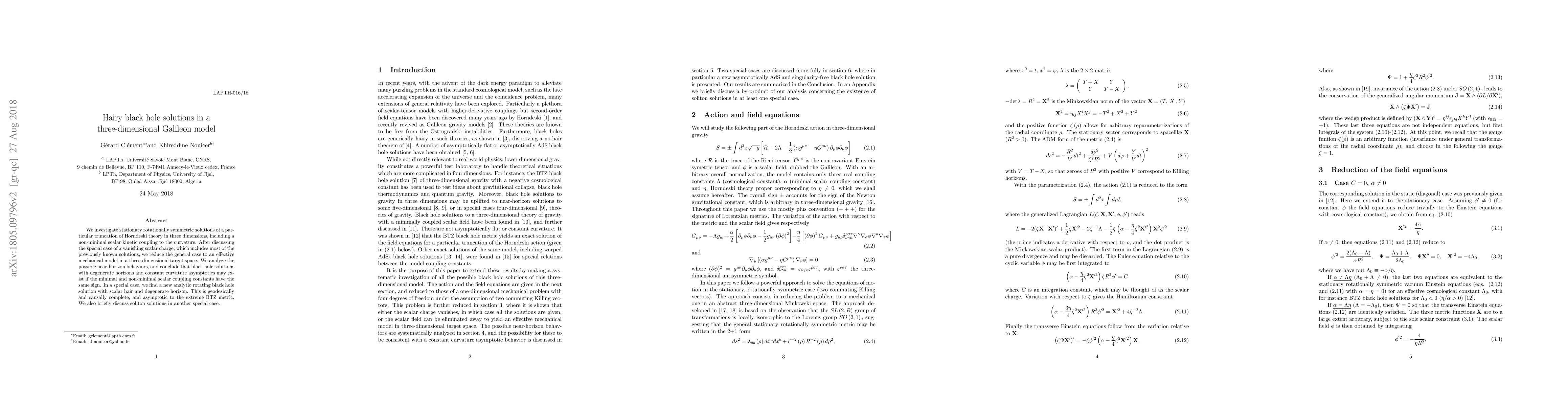 We investigate stationary rotationally symmetric solutions of a particular truncation of Horndeski theory in three dimensions, including a non-minimal scalar kinetic coupling to the curvature. After discussing the special case of a vanishing scalar charge, which includes most of the previously known solutions, we reduce the general case to an effective mechanical model in a three-dimensional target space. We analyze the possible near-horizon behaviors, and conclude that black hole solutions with degenerate horizons and constant curvature asymptotics may exist if the minimal and non-minimal scalar coupling constants have the same sign. In a special case, we find a new analytic rotating black hole solution with scalar hair and degenerate horizon. This is geodesically and causally complete, and asymptotic to the extreme BTZ metric. We also briefly discuss soliton solutions in another special case.