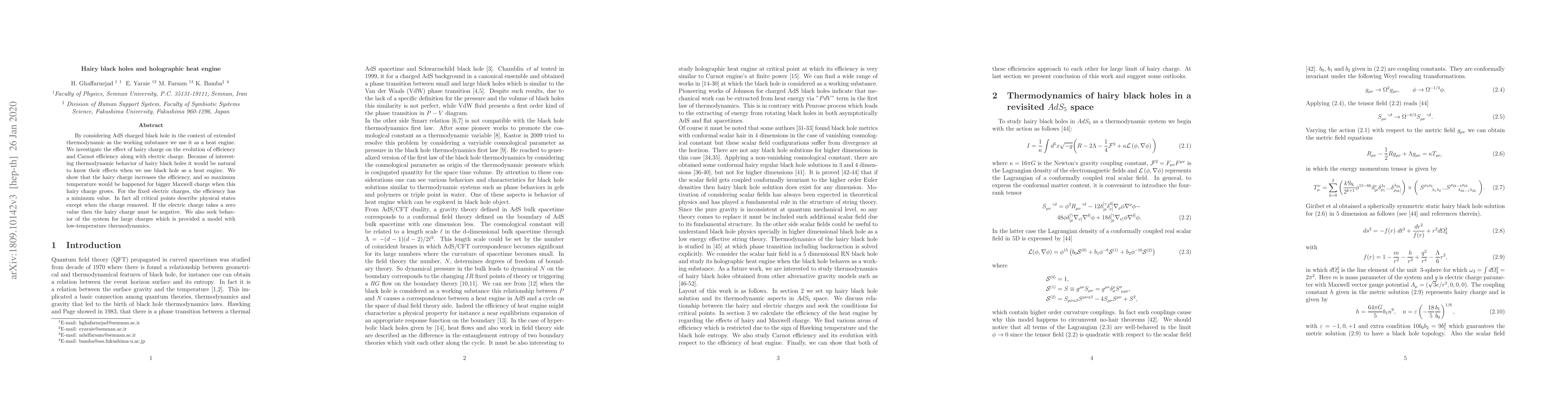 By considering AdS charged black hole in the context of extended thermodynamic as the working substance we use it as a heat engine. We investigate the effect of hairy charge on the evolution of efficiency and Carnot efficiency along with electric charge. Because of interesting thermodynamic behavior of hairy black holes it would be natural to know their effects when we use black hole as a heat engine. We show that the hairy charge increases the efficiency, and so maximum temperature would be happened for bigger Maxwell charge when this hairy charge grows. For the fixed electric charges, the efficiency has a minimum value. In fact all critical points describe physical states except when the charge removed. If the electric charge takes a zero value then the hairy charge must be negative. We also seek behavior of the system for large charges which is provided a model with low-temperature thermodynamics.