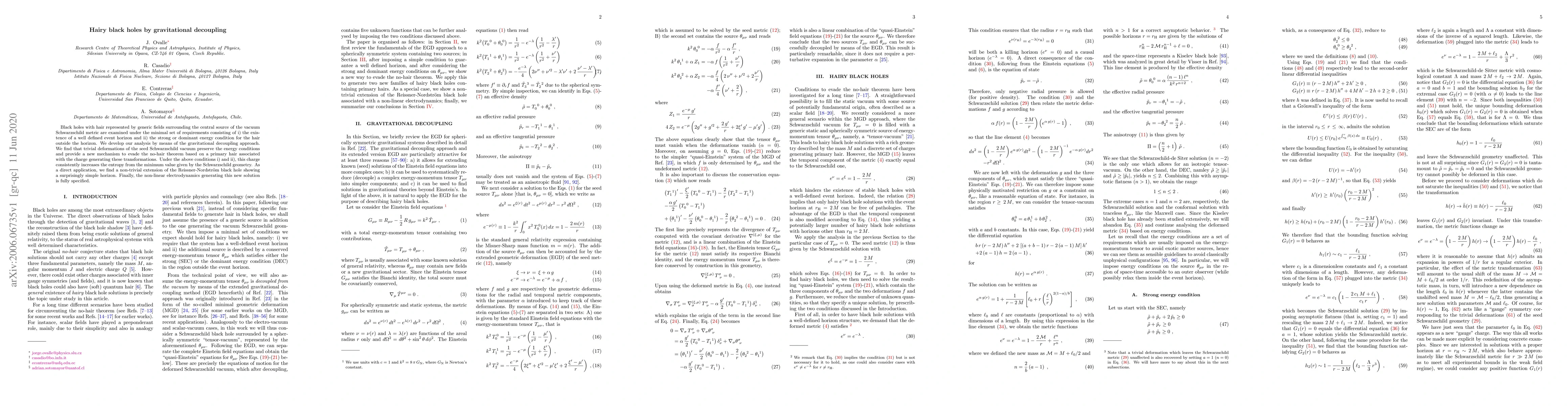 The paper explores black holes with 'hair' (generic fields) around a Schwarzschild core, maintaining event horizons and energy conditions. Using gravitational decoupling, it finds that minor Schwarzschild deformations can increase entropy, evading the no-hair theorem. A new Reissner-Nordström extension with a simple horizon is proposed, along with a non-linear electrodynamics description.