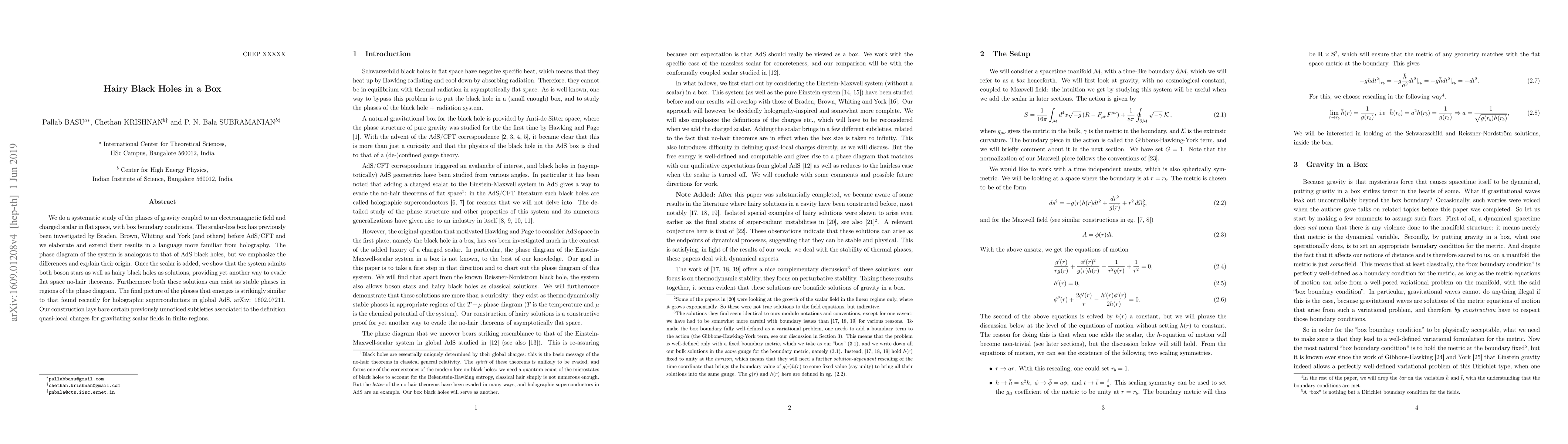 We do a systematic study of the phases of gravity coupled to an electromagnetic field and charged scalar in flat space, with box boundary conditions. The scalar-less box has previously been investigated by Braden, Brown, Whiting and York (and others) before AdS/CFT and we elaborate and extend their results in a language more familiar from holography. The phase diagram of the system is analogous to that of AdS black holes, but we emphasize the differences and explain their origin. Once the scalar is added, we show that the system admits both boson stars as well as hairy black holes as solutions, providing yet another way to evade flat space no-hair theorems. Furthermore both these solutions can exist as stable phases in regions of the phase diagram. The final picture of the phases that emerges is strikingly similar to that found recently for holographic superconductors in global AdS, arXiv: 1602.07211. Our construction lays bare certain previously unnoticed subtleties associated to the definition quasi-local charges for gravitating scalar fields in finite regions.
