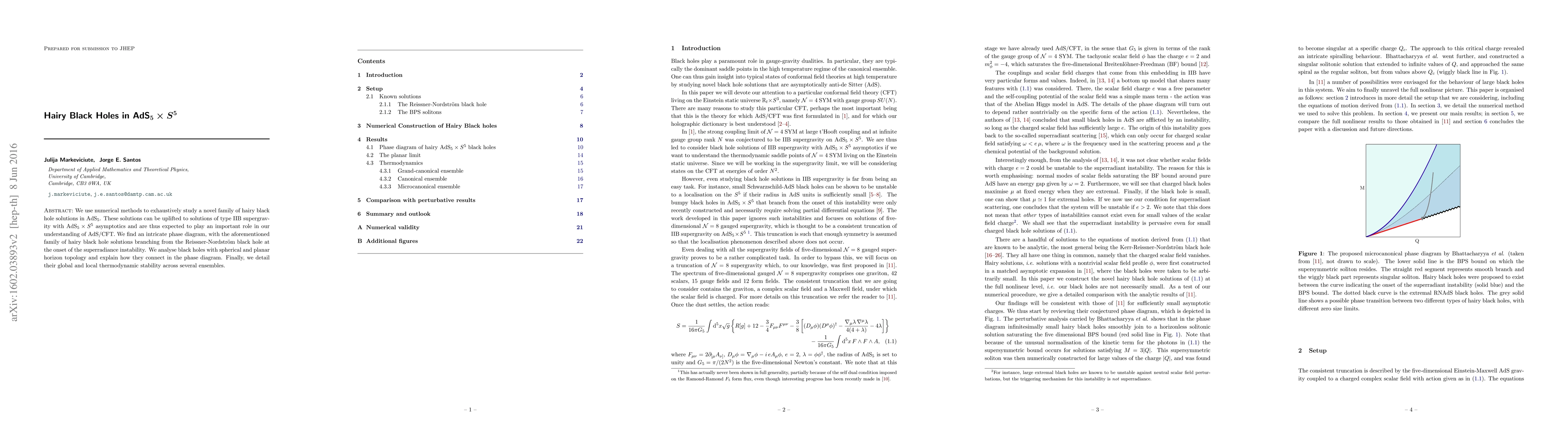 The paper investigates novel hairy black hole solutions in AdS$_5$ using numerical methods, revealing a complex phase diagram and their connection to Reissner-Nordström black holes. The solutions are uplifted to type IIB supergravity with AdS$_5\times S^5$ asymptotics, crucial for AdS/CFT correspondence, and their thermodynamic stability is analyzed across different ensembles.