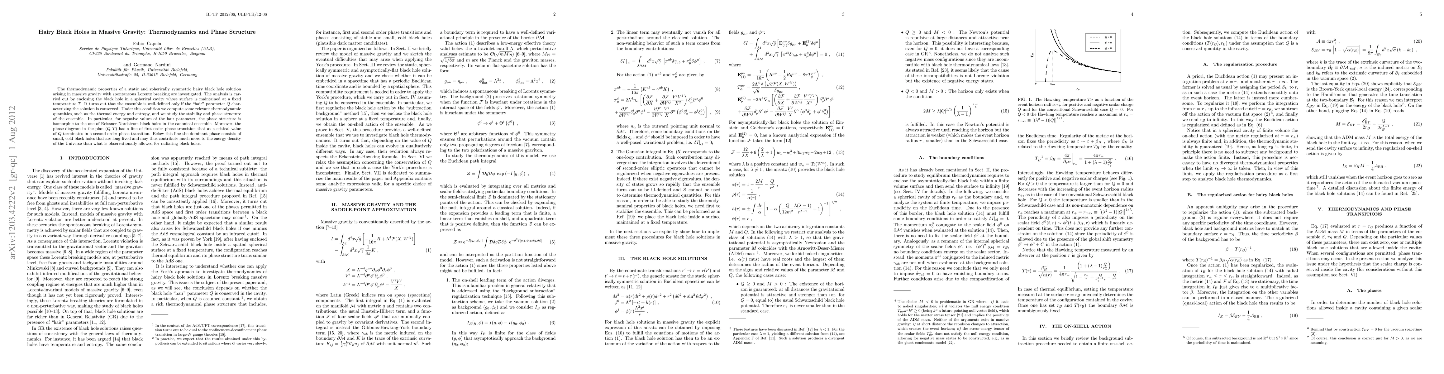 The thermodynamic properties of a static and spherically symmetric hairy black hole solution arising in massive gravity with spontaneous Lorentz breaking are investigated. The analysis is carried out by enclosing the black hole in a spherical cavity whose surface is maintained at a fixed temperature $T$. It turns out that the ensemble is well-defined only if the "hair" parameter $Q$ characterizing the solution is conserved. Under this condition we compute some relevant thermodynamic quantities, such as the thermal energy and entropy, and we study the stability and phase structure of the ensemble. In particular, for negative values of the hair parameter, the phase structure is isomorphic to the one of Reissner-Nordstrom black holes in the canonical ensemble. Moreover, the phase-diagram in the plan ($Q,T$) has a line of first-order phase transition that at a critical value of $Q$ terminates in a second-order phase transition. Below this line the dominant phase consists of small, cold black holes that are long-lived and may thus contribute much more to the energy density of the Universe than what is observationally allowed for radiating black holes.