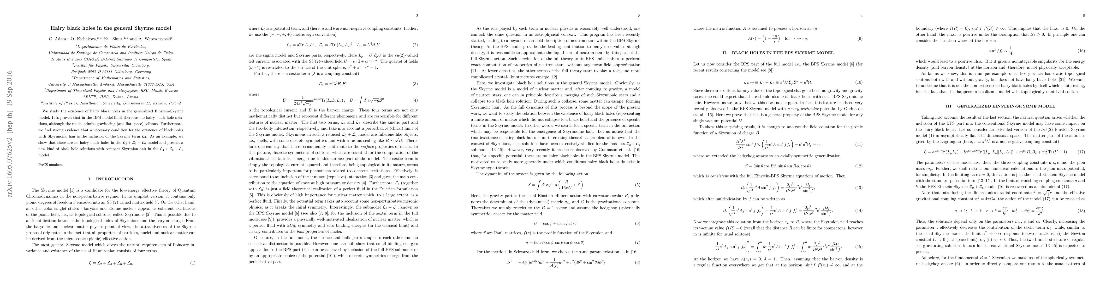The paper presents a detailed numerical analysis of the generalized Skyrme model, proving the non-existence of hairy black hole solutions in the BPS submodel and identifying conditions for their existence in other models, including a new type of compact hairy black hole solution.