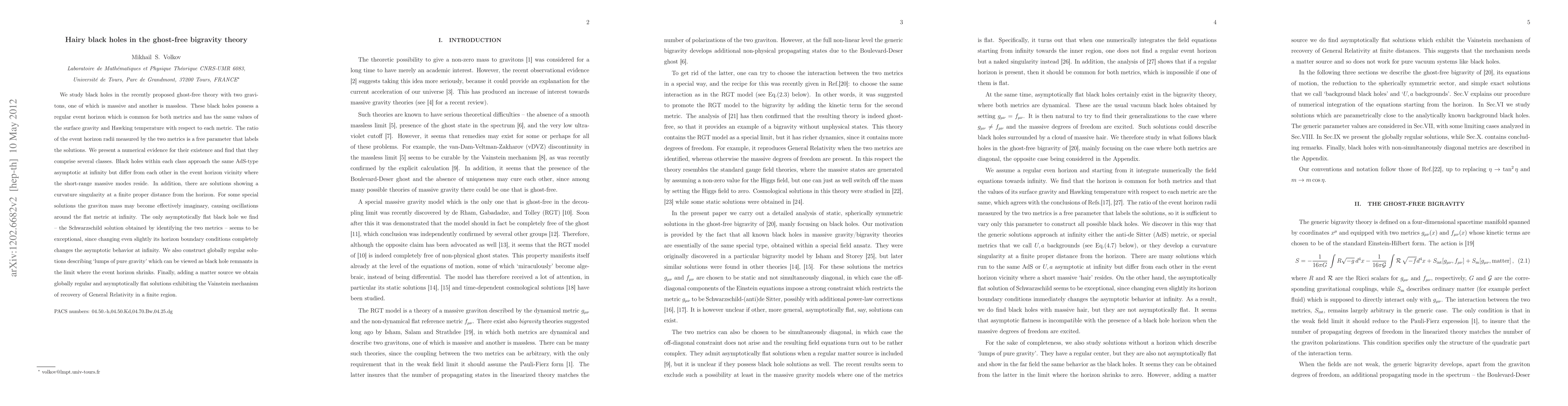 We study black holes in the recently proposed ghost-free theory with two gravitons, one of which is massive and another is massless. These black holes possess a regular event horizon which is common for both metrics and has the same values of the surface gravity and Hawking temperature with respect to each metric. The ratio of the event horizon radii measured by the two metrics is a free parameter that labels the solutions. We present a numerical evidence for their existence and find that they comprise several classes. Black holes within each class approach the same AdS-type asymptotic at infinity but differ from each other in the event horizon vicinity where the short-range massive modes reside. In addition, there are solutions showing a curvature singularity at a finite proper distance from the horizon. For some special solutions the graviton mass may become effectively imaginary, causing oscillations around the flat metric at infinity. The only asymptotically flat black hole we find -- the Schwarzschild solution obtained by identifying the two metrics -- seems to be exceptional, since changing even slightly its horizon boundary conditions completely changes the asymptotic behavior at infinity. We also construct globally regular solutions describing `lumps of pure gravity' which can be viewed as black hole remnants in the limit where the event horizon shrinks. Finally, adding a matter source we obtain globally regular and asymptotically flat solutions exhibiting the Vainstein mechanism of recovery of General Relativity in a finite region.