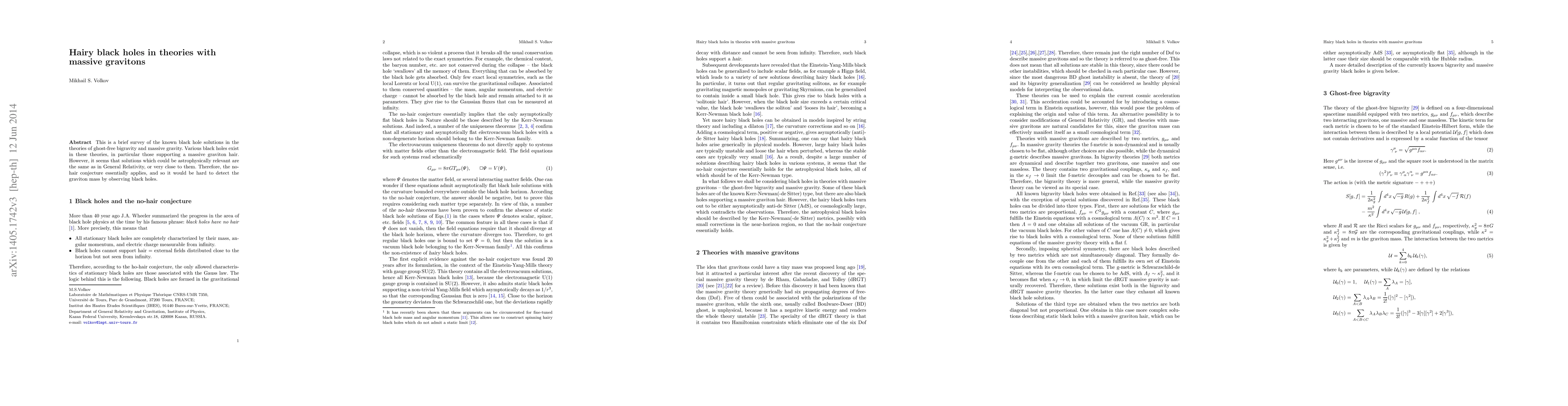 This paper explores black hole solutions in ghost-free bigravity and massive gravity theories, finding that while massive graviton hair exists, astrophysically relevant solutions closely resemble those in General Relativity, supporting the no-hair conjecture. Thus, detecting graviton mass via black holes remains challenging.