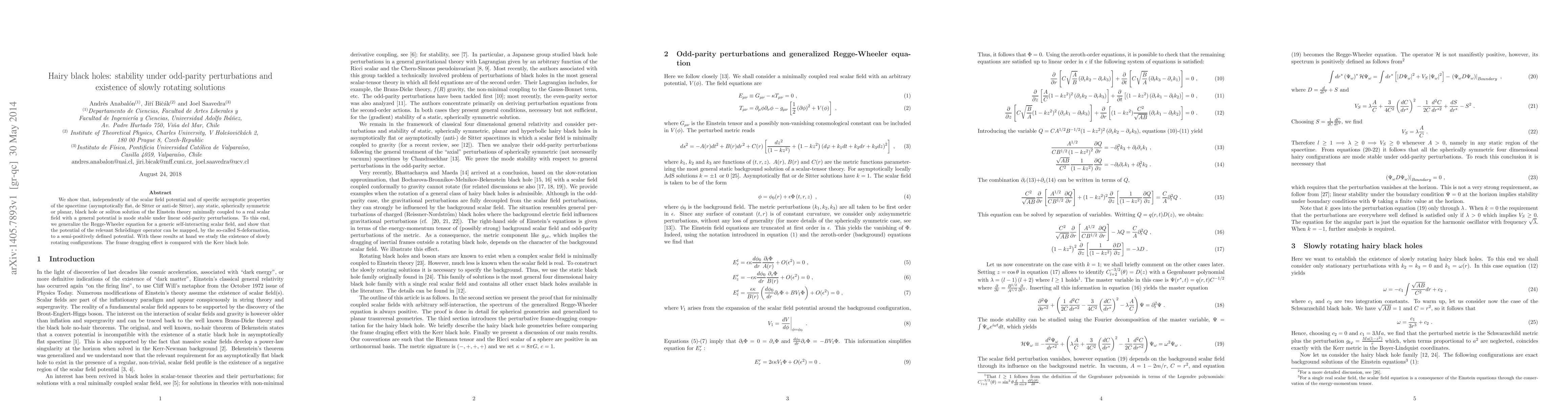 This paper demonstrates the mode stability of static, spherically symmetric black holes under linear odd-parity perturbations, regardless of the scalar field potential or spacetime asymptotics. It also explores the existence of slowly rotating solutions, comparing the frame dragging effect to that of the Kerr black hole.