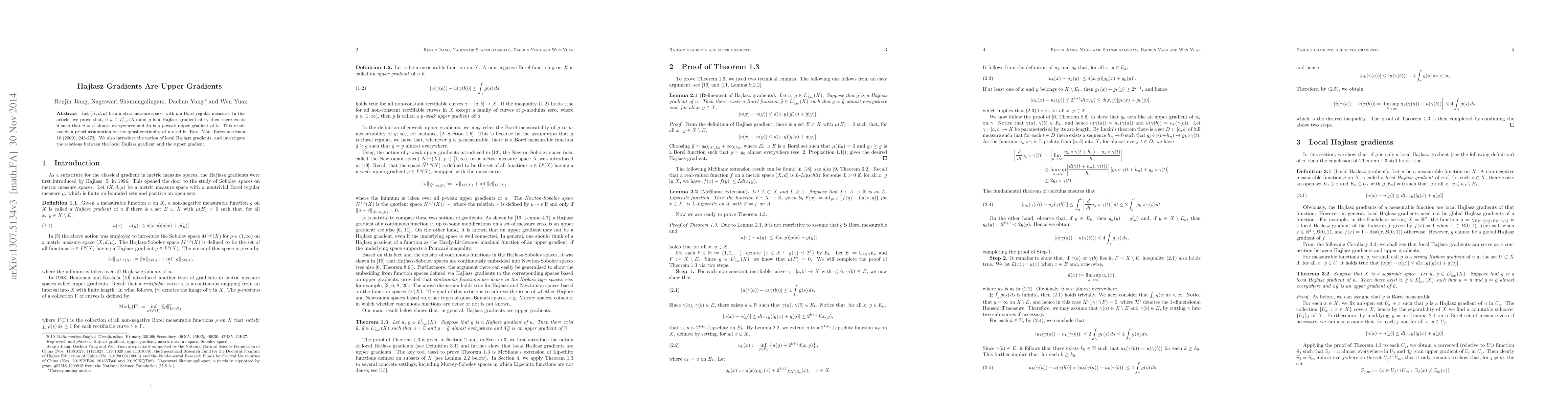 Let $(X, d, \mu)$ be a metric measure space, with $\mu$ a Borel regular measure. In this paper, we prove that, if $u\in L^1_{{\mathop\mathrm{\,loc\,}}}(X)$ and $g$ is a Haj{\l}asz gradient of $u$, then there exists $\widetilde u$ such that $\widetilde u=u$ almost everywhere and $4g$ is a $p$-weak upper gradient of $\widetilde u$. This result avoids a priori assumption on the quasi-continuity of $u$ used in [Rev. Mat. Iberoamericana 16 (2000), 243-279]. As an application, an embedding of the Morrey-type function spaces based on Haj{\l}asz-gradients into the corresponding function spaces based on upper gradients is obtained. We also introduce the notion of local Haj{\l}asz gradient, and investigate the relations between local Haj{\l}asz gradient and upper gradient.