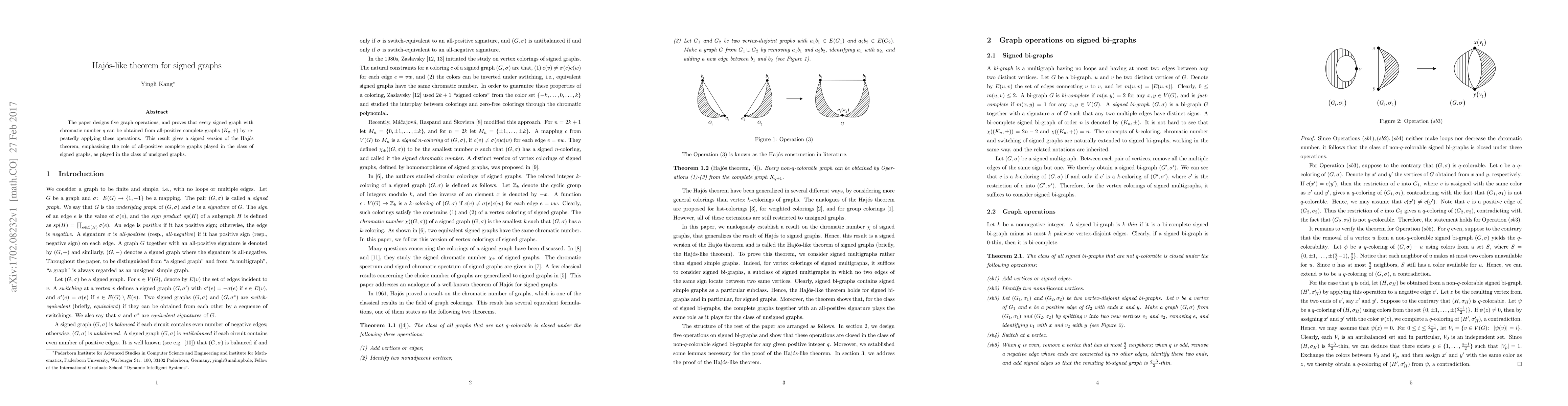 The paper designs five graph operations, and proves that every signed graph with chromatic number $q$ can be obtained from all-positive complete graphs $(K_q,+)$ by repeatedly applying these operations. This result gives a signed version of the Haj\'os theorem, emphasizing the role of all-positive complete graphs played in the class of signed graphs, as played in the class of unsigned graphs.