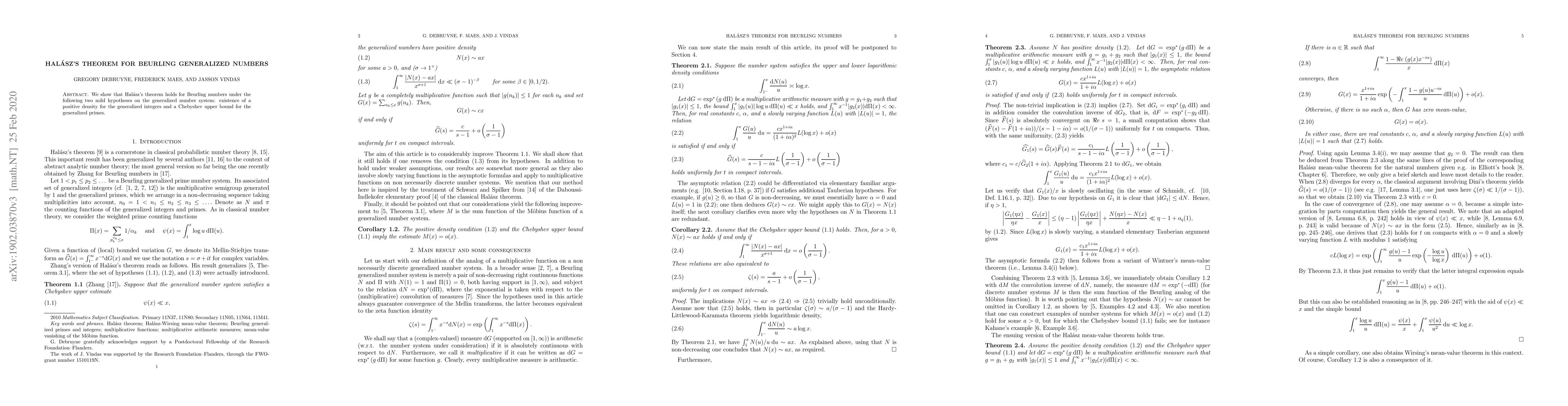 Summary: Halász's theorem is proven applicable to Beurling generalized numbers under conditions of positive density for generalized integers and a Chebyshev upper bound for generalized primes. This extends the theorem's applicability to a broader number system.