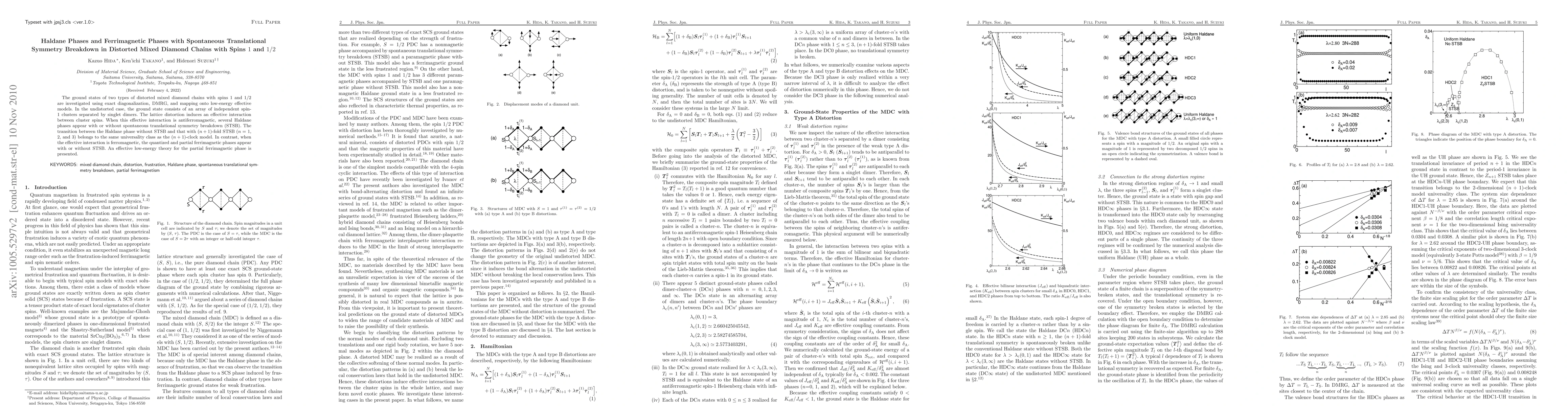 The ground states of two types of distorted mixed diamond chains with spins 1 and 1/2 are investigated using exact diagonalization, DMRG, and mapping onto low-energy effective models. In the undistorted case, the ground state consists of an array of independent spin-1 clusters separated by singlet dimers. The lattice distortion induces an effective interaction between cluster spins. When this effective interaction is antiferromagnetic, several Haldane phases appear with or without spontaneous translational symmetry breakdown (STSB). The transition between the Haldane phase without STSB and that with $(n+1)$-fold STSB ($n$ = 1, 2, and 3) belongs to the same universality class as the $(n+1)$-clock model. In contrast, when the effective interaction is ferromagnetic, the quantized and partial ferrimagnetic phases appear with or without STSB. An effective low-energy theory for the partial ferrimagnetic phase is presented.