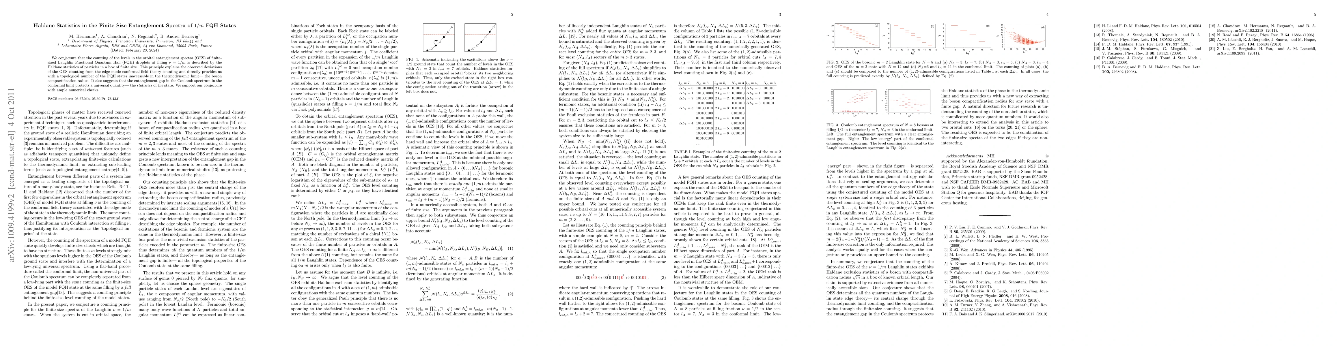 This paper proposes that Haldane statistics govern the entanglement spectra of finite-sized Laughlin Fractional Quantum Hall droplets, revealing a topological number related to the boson compactification radius.