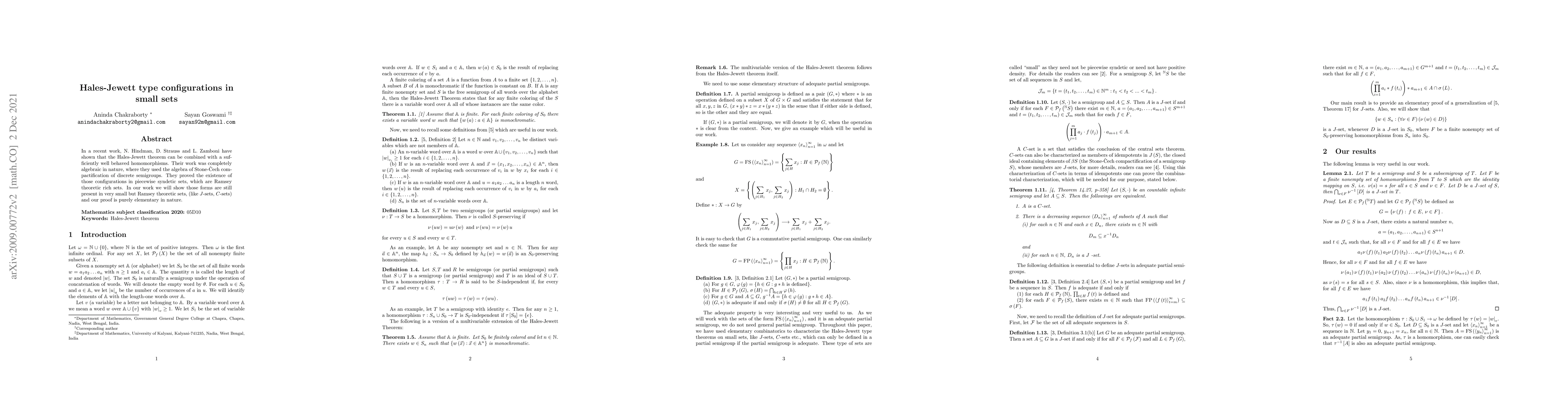 Researchers extend Hales-Jewett theorem to small Ramsey-theoretic sets like J-sets and C-sets, proving the existence of certain configurations in these sets using an elementary proof.