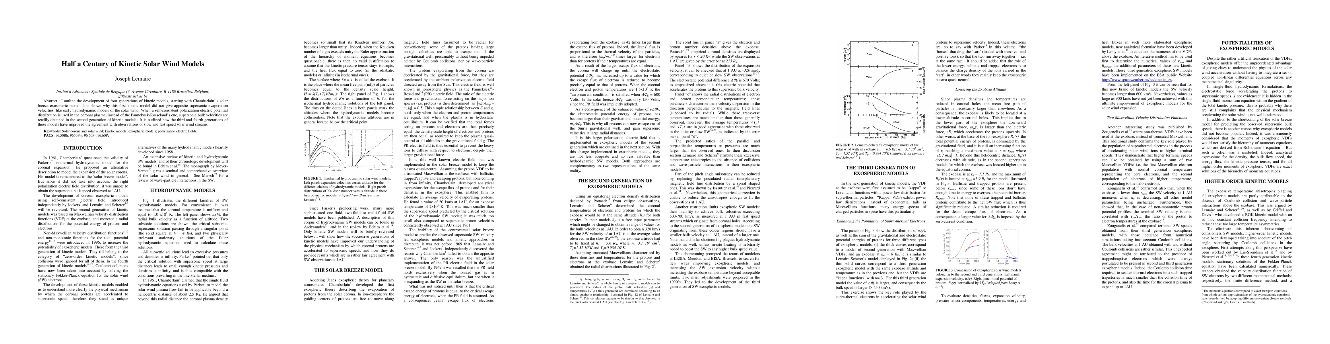 This paper traces the evolution of kinetic solar wind models over fifty years, from Chamberlain's initial solar breeze model to the latest generations, highlighting improvements in achieving supersonic velocities and better observational agreement through refined electric potential distributions and advanced theoretical frameworks.