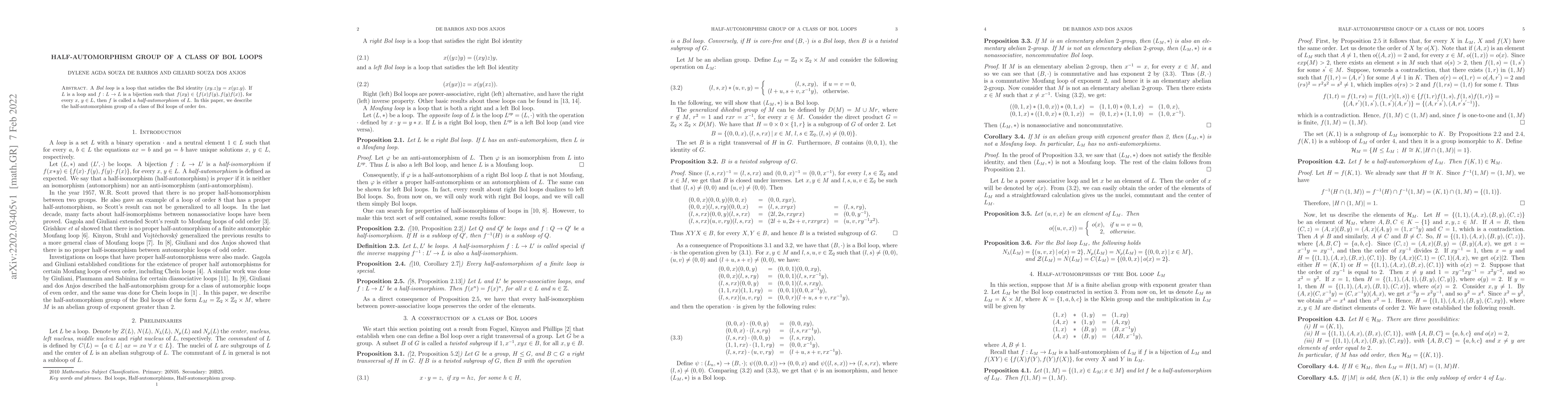 This paper investigates the half-automorphism group of a specific class of Bol loops, defined by the Bol identity, and focuses on loops of order $4m$. It characterizes the bijections that satisfy the half-automorphism property, providing a detailed description of their group structure.