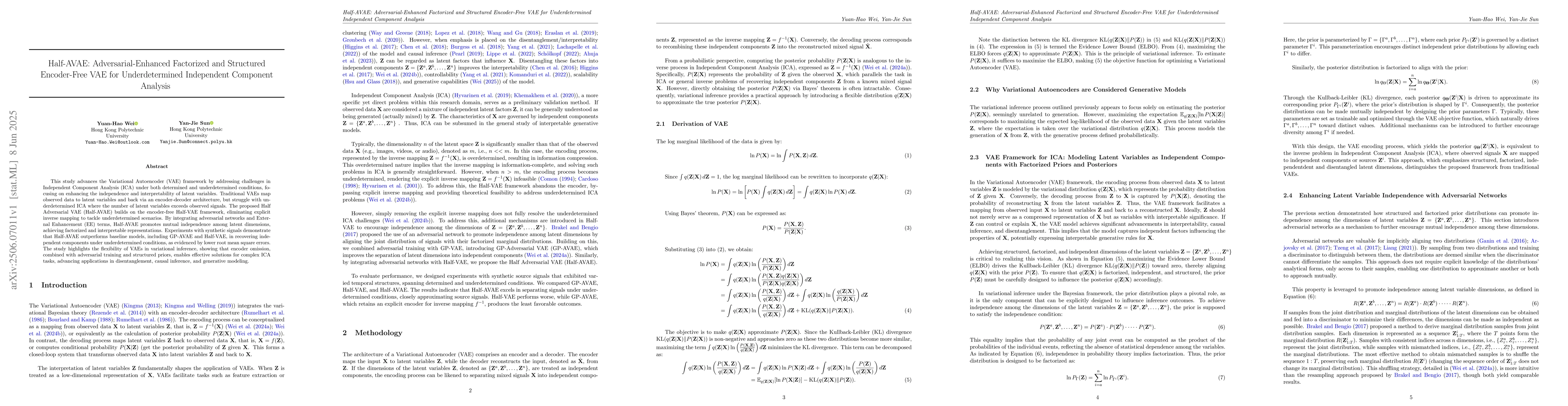 This study advances the Variational Autoencoder (VAE) framework by addressing challenges in Independent Component Analysis (ICA) under both determined and underdetermined conditions, focusing on enhancing the independence and interpretability of latent variables. Traditional VAEs map observed data to latent variables and back via an encoder-decoder architecture, but struggle with underdetermined ICA where the number of latent variables exceeds observed signals. The proposed Half Adversarial VAE (Half-AVAE) builds on the encoder-free Half-VAE framework, eliminating explicit inverse mapping to tackle underdetermined scenarios. By integrating adversarial networks and External Enhancement (EE) terms, Half-AVAE promotes mutual independence among latent dimensions, achieving factorized and interpretable representations. Experiments with synthetic signals demonstrate that Half-AVAE outperforms baseline models, including GP-AVAE and Half-VAE, in recovering independent components under underdetermined conditions, as evidenced by lower root mean square errors. The study highlights the flexibility of VAEs in variational inference, showing that encoder omission, combined with adversarial training and structured priors, enables effective solutions for complex ICA tasks, advancing applications in disentanglement, causal inference, and generative modeling.