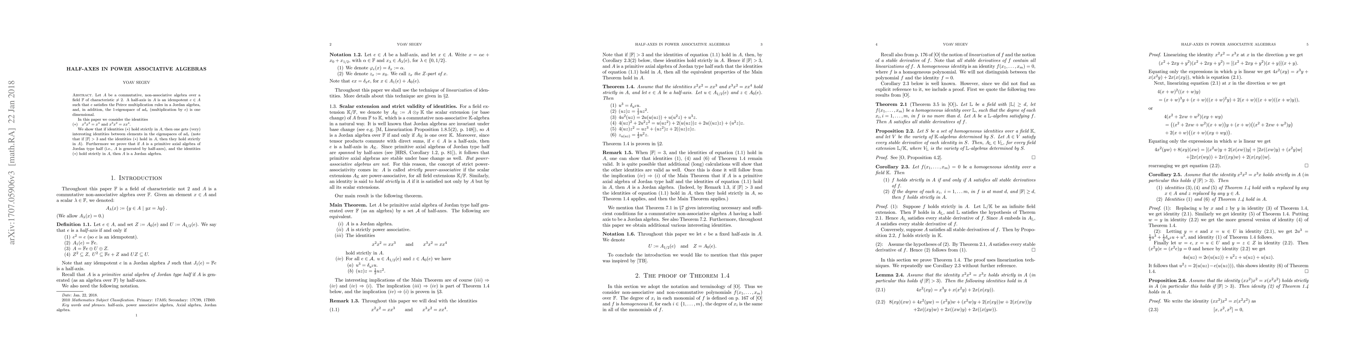Let $A$ be a commutative, non-associative algebra over a field $\mathbb{F}$ of characteristic $\ne 2$. A half-axis in $A$ is an idempotent $e\in A$ such that $e$ satisfies the Peirce multiplication rules in a Jordan algebra, and, in addition, the $1$-eigenspace of ${\rm ad}_e$ (multiplication by $e$) is one dimensional. In this paper we consider the identities $(*)$ $x^2x^2=x^4$ and $x^3x^2=xx^4.$ We show that if identities $(*)$ hold strictly in $A,$ then one gets (very) interesting identities between elements in the eigenspaces of ${\rm ad}_e$ (note that if $|\mathbb{F}|>3$ and the identities $(*)$ hold in $A,$ then they hold strictly in $A$). Furthermore we prove that if $A$ is a primitive axial algebra of Jordan type half (i.e., $A$ is generated by half-axes), and the identities $(*)$ hold strictly in $A,$ then $A$ is a Jordan algebra.