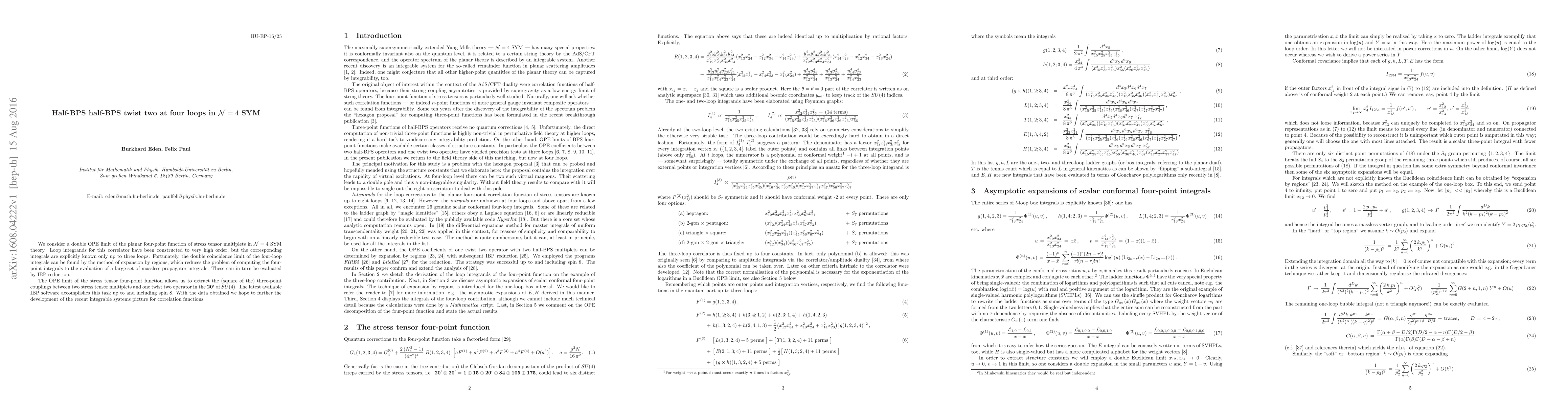 Researchers in N=4 SYM theory used expansion by regions to find a four-loop limit of the stress tensor correlator, allowing them to calculate three-point couplings between stress tensor multiplets and twist two operators.