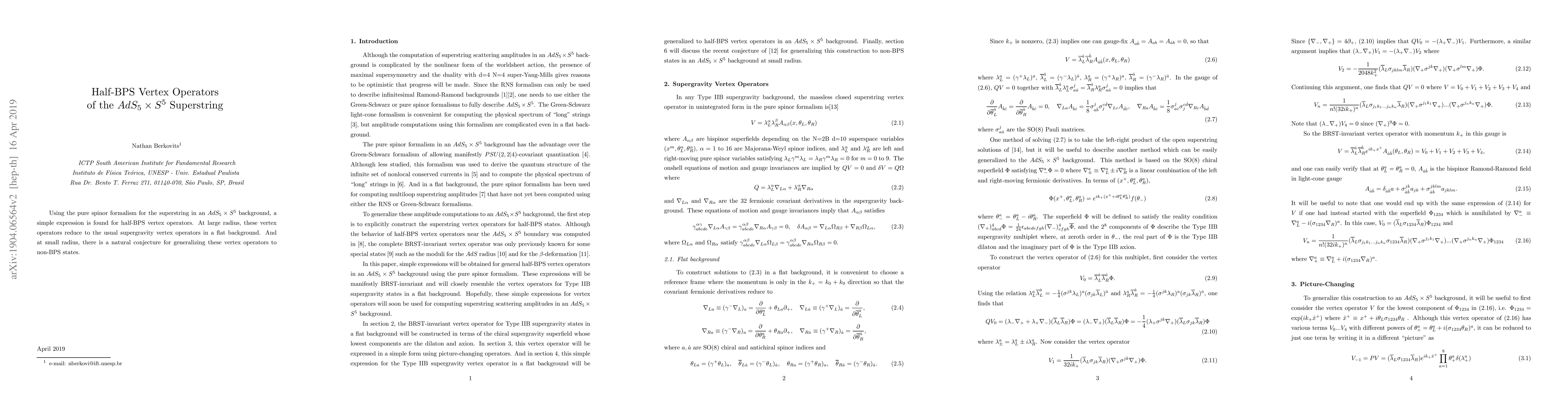 The paper presents a pure spinor formalism to derive simple expressions for half-BPS vertex operators in the $AdS_5\times S^5$ superstring background. These operators transition to standard supergravity vertex operators in flat space at large radius, with a conjecture for extending them to non-BPS states at small radius.