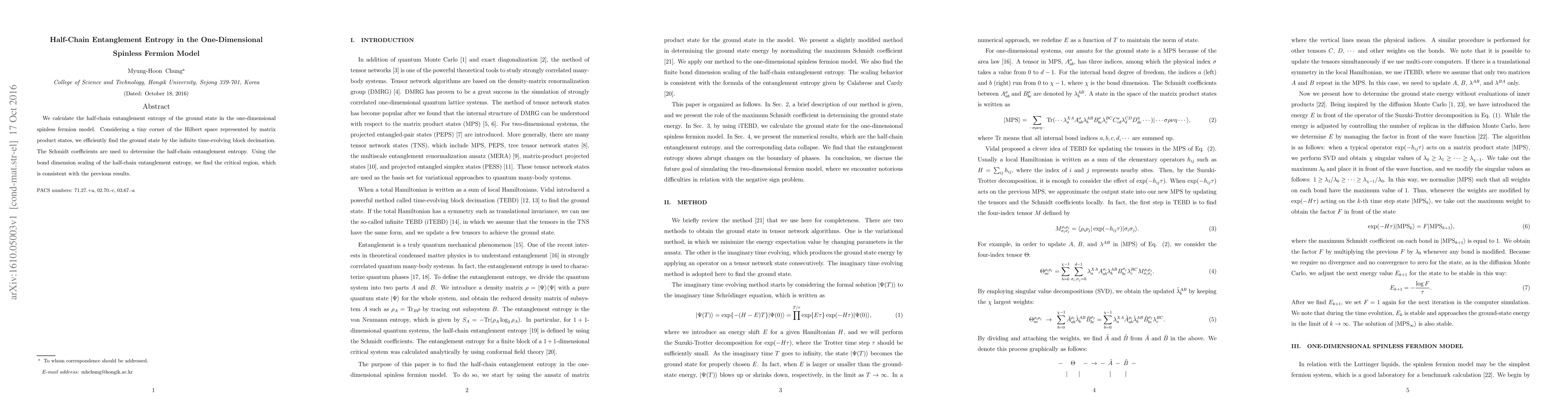 We calculate the half-chain entanglement entropy of the ground state in the one-dimensional spinless fermion model. Considering a tiny corner of the Hilbert space represented by matrix product states, we efficiently find the ground state by the infinite time-evolving block decimation. The Schmidt coefficients are used to determine the half-chain entanglement entropy. Using the bond dimension scaling of the half-chain entanglement entropy, we find the critical region, which is consistent with the previous results.