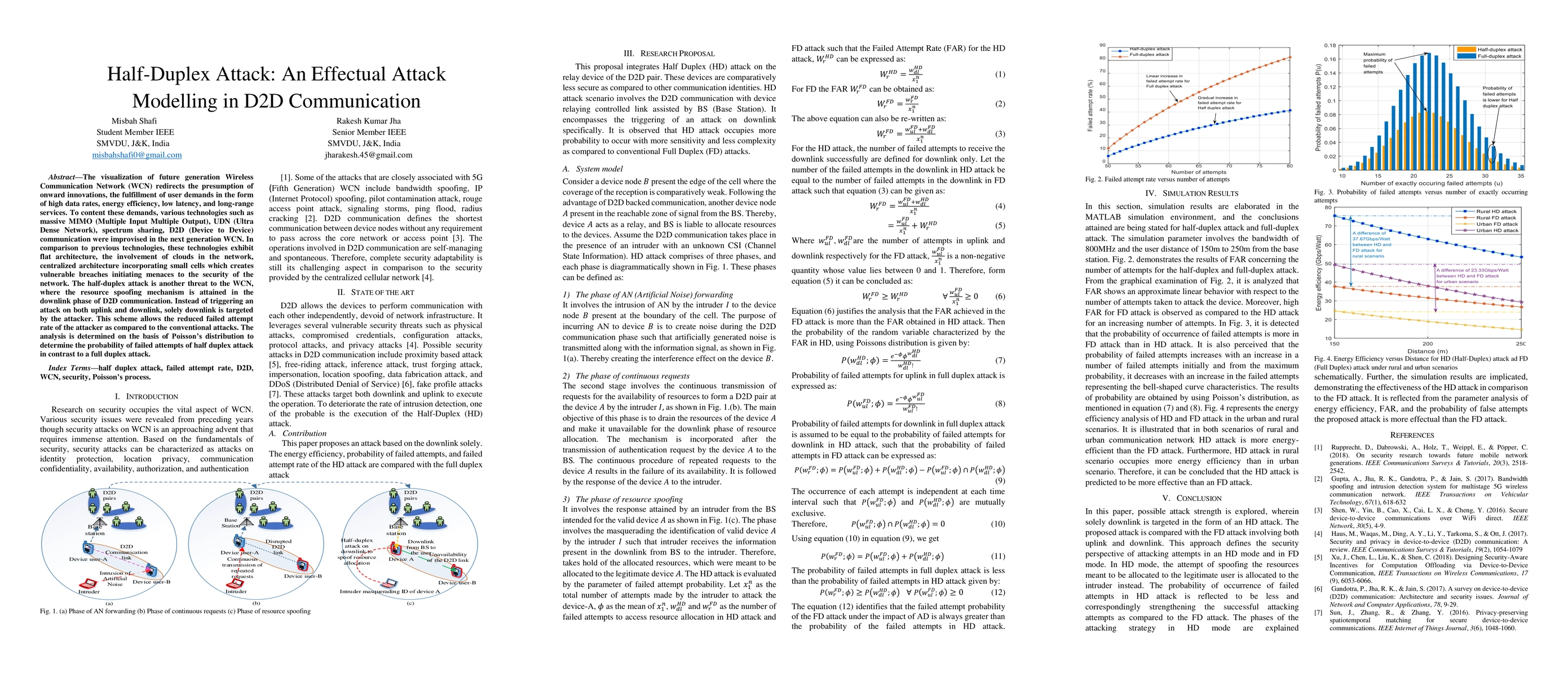 The visualization of future generation Wireless Communication Network WCN redirects the presumption of onward innovations, the fulfillment of user demands in the form of high data rates, energy efficiency, low latency, and long-range services. To content these demands, various technologies such as massive MIMO Multiple Input Multiple Output, UDN Ultra Dense Network, spectrum sharing, D2D Device to Device communication were improvised in the next generation WCN. In comparison to previous technologies, these technologies exhibit flat architecture, the involvement of clouds in the network, centralized architecture incorporating small cells which creates vulnerable breaches initiating menaces to the security of the network. The half-duplex attack is another threat to the WCN, where the resource spoofing mechanism is attained in the downlink phase of D2D communication. Instead of triggering an attack on both uplink and downlink, solely downlink is targeted by the attacker. This scheme allows the reduced failed attempt rate of the attacker as compared to the conventional attacks. The analysis is determined on the basis of Poissons distribution to determine the probability of failed attempts of half duplex attack in contrast to a full duplex attack