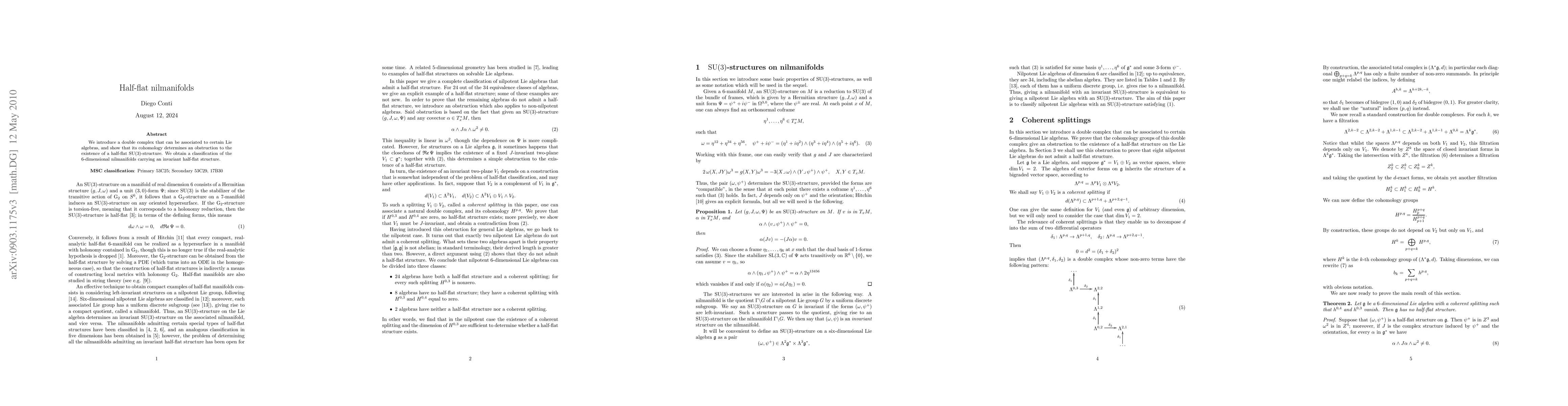 Researchers introduced a double complex to study half-flat SU(3)-structures on 6-dimensional nilmanifolds, finding a classification that determines an obstruction to their existence.
