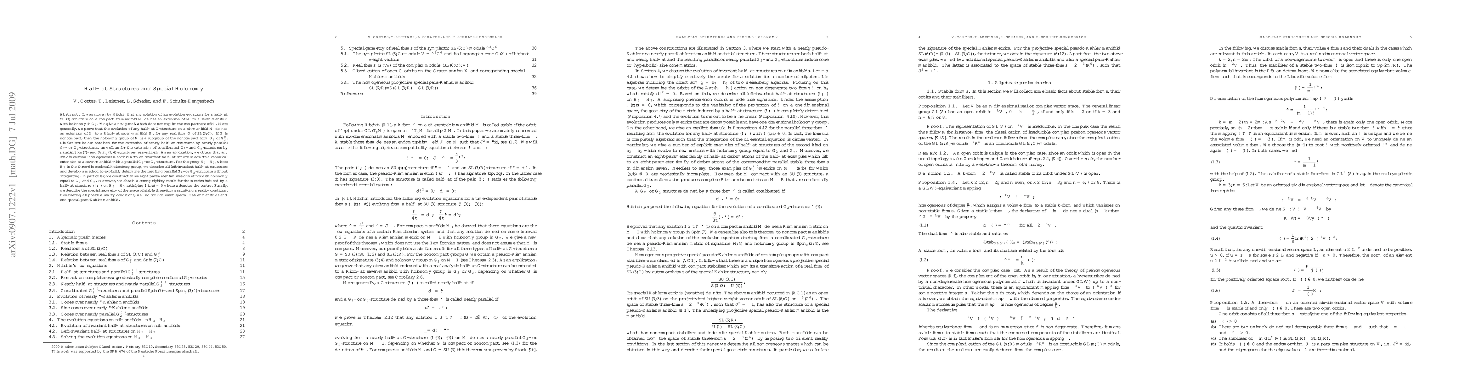 It was proven by Hitchin that any solution of his evolution equations for a half-flat SU(3)-structure on a compact six-manifold M defines an extension of M to a seven-manifold with holonomy in G_2. We give a new proof, which does not require the compactness of M. More generally, we prove that the evolution of any half-flat G-structure on a six-manifold M defines an extension of M to a Ricci-flat seven-manifold N, for any real form G of SL(3,C). If G is noncompact, then the holonomy group of N is a subgroup of the noncompact form G_2^* of G_2^C. Similar results are obtained for the extension of nearly half-flat structures by nearly parallel G_2- or G_2^*-structures, as well as for the extension of cocalibrated G_2- and G_2^*-structures by parallel Spin(7)- and Spin(3,4)-structures, respectively. As an application, we obtain that any six-dimensional homogeneous manifold with an invariant half-flat structure admits a canonical extension to a seven-manifold with a parallel G_2- or G_2^*-structure. For the group H_3 \times H_3, where H_3 is the three-dimensional Heisenberg group, we describe all left-invariant half-flat structures and develop a method to explicitly determine the resulting parallel G_2- or G_2^*-structure without integrating. In particular, we construct three eight-parameter families of metrics with holonomy equal to G_2 and G_2^*. Moreover, we obtain a strong rigidity result for the metrics induced by a half-flat structure (\omega,\rho) on H_3 \times H_3 satisfying \omega(Z,Z)=0 where Z denotes the centre. Finally, we describe the special geometry of the space of stable three-forms satisfying a reality condition. Considering all possible reality conditions, we find four different special K\"ahler manifolds and one special para-K\"ahler manifold.