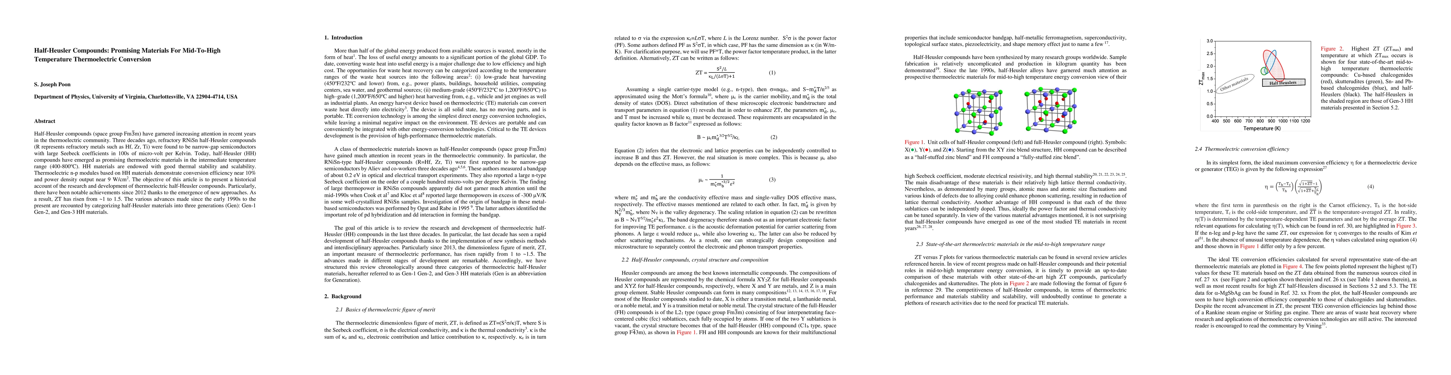 This paper reviews the development of thermoelectric half-Heusler compounds, highlighting significant advancements since 2012 that have improved their performance, with the dimensionless figure of merit ZT rising from ~1 to 1.5, and categorizing them into three generations based on their progress.