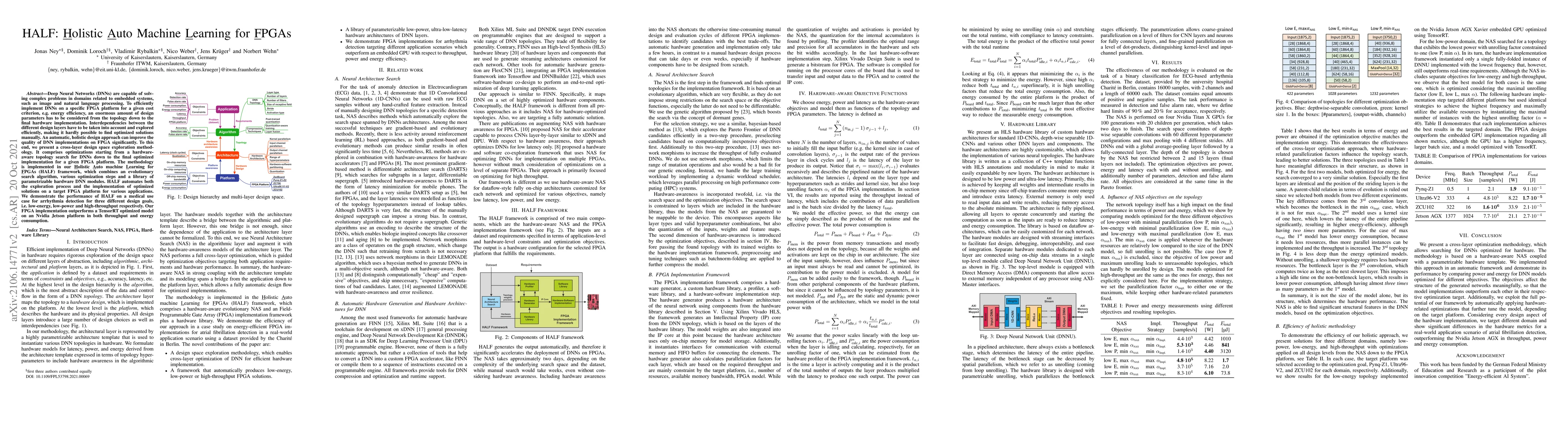 Deep Neural Networks (DNNs) are capable of solving complex problems in domains related to embedded systems, such as image and natural language processing. To efficiently implement DNNs on a specific FPGA platform for a given cost criterion, e.g. energy efficiency, an enormous amount of design parameters has to be considered from the topology down to the final hardware implementation. Interdependencies between the different design layers have to be taken into account and explored efficiently, making it hardly possible to find optimized solutions manually. An automatic, holistic design approach can improve the quality of DNN implementations on FPGA significantly. To this end, we present a cross-layer design space exploration methodology. It comprises optimizations starting from a hardware-aware topology search for DNNs down to the final optimized implementation for a given FPGA platform. The methodology is implemented in our Holistic Auto machine Learning for FPGAs (HALF) framework, which combines an evolutionary search algorithm, various optimization steps and a library of parametrizable hardware DNN modules. HALF automates both the exploration process and the implementation of optimized solutions on a target FPGA platform for various applications. We demonstrate the performance of HALF on a medical use case for arrhythmia detection for three different design goals, i.e. low-energy, low-power and high-throughput respectively. Our FPGA implementation outperforms a TensorRT optimized model on an Nvidia Jetson platform in both throughput and energy consumption.