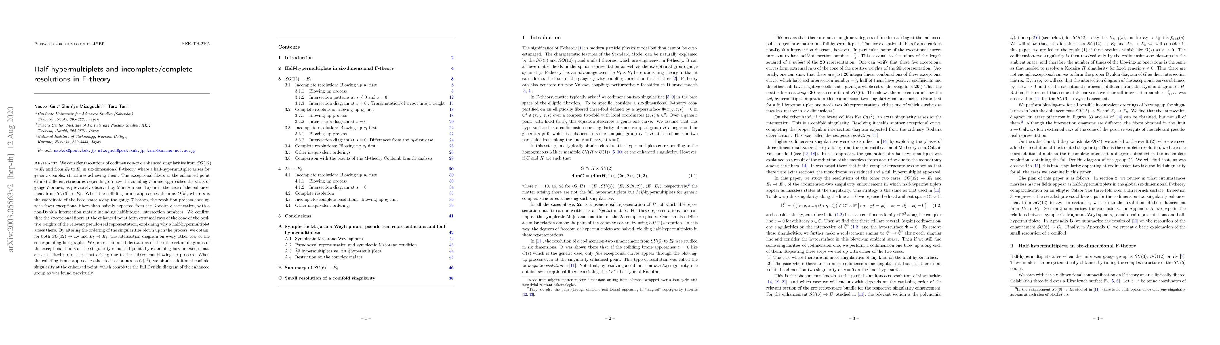 We consider resolutions of codimension-two enhanced singularities from $SO(12)$ to $E_7$ and from $E_7$ to $E_8$ in six-dimensional F-theory, where a half-hypermultiplet arises for generic complex structures achieving them. The exceptional fibers at the enhanced point exhibit different structures depending on how the colliding 7-brane approaches the stack of gauge 7-branes, as previously observed by Morrison and Taylor in the case of the enhancement from $SU(6)$ to $E_6$. When the colliding brane approaches them as $O(s)$, where $s$ is the coordinate of the base space along the gauge 7-branes, the resolution process ends up with fewer exceptional fibers than naively expected from the Kodaira classification, with a non-Dynkin intersection matrix including half-integral intersection numbers. We confirm that the exceptional fibers at the enhanced point form extremal rays of the cone of the positive weights of the relevant pseudo-real representation, explaining why a half-hypermultiplet arises there. By altering the ordering of the singularities blown up in the process, we obtain, for both $SO(12)\rightarrow E_7$ and $E_7\rightarrow E_8$, the intersection diagram on every other row of the corresponding box graphs. We present detailed derivations of the intersection diagrams of the exceptional fibers at the singularity enhanced points by examining how an exceptional curve is lifted up on the chart arising due to the subsequent blowing-up process. When the colliding brane approaches the stack of branes as $O(s^2)$, we obtain additional conifold singularity at the enhanced point, which completes the full Dynkin diagram of the enhanced group as was found previously.