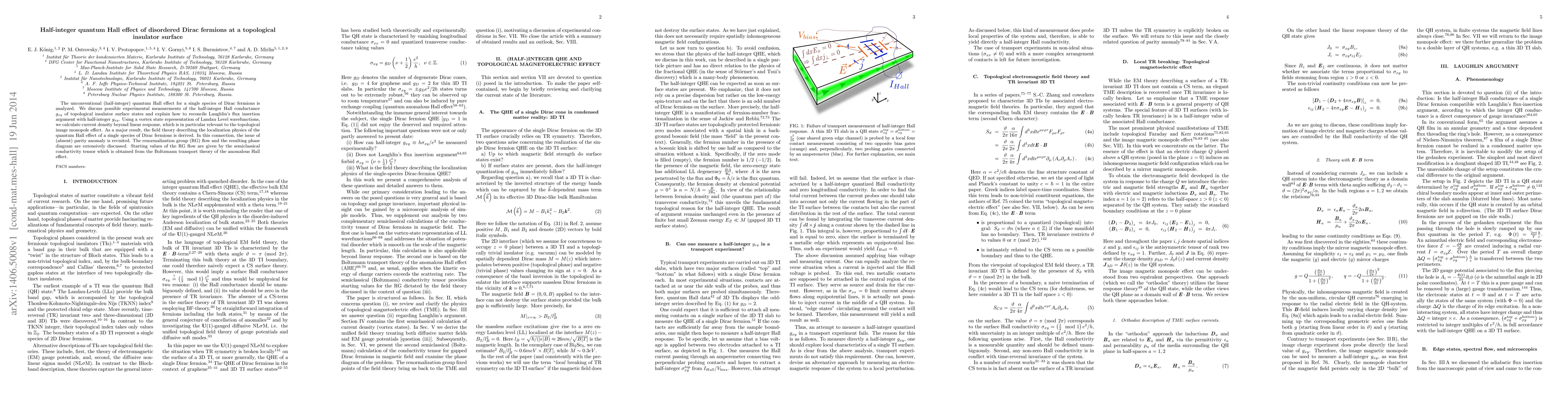 This paper analyzes the half-integer quantum Hall effect in disordered Dirac fermions on topological insulator surfaces, deriving a field theory for the quantum Hall effect of single Dirac fermion species and discussing the experimental measurement of the half-integer Hall conductance. It also addresses the issue of the absent parity anomaly and details the renormalization group flow and its resulting phase diagram.
