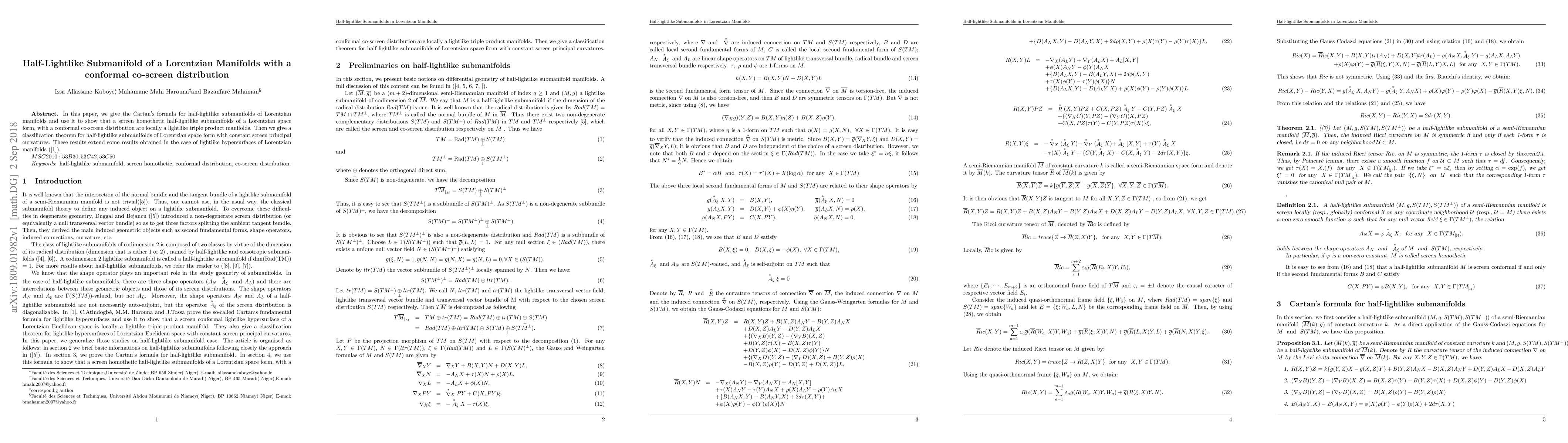 This paper presents Cartan's formula for half-lightlike submanifolds in Lorentzian manifolds, demonstrating that certain types form locally lightlike triple product manifolds. It also provides a classification theorem for these submanifolds with constant screen principal curvatures.
