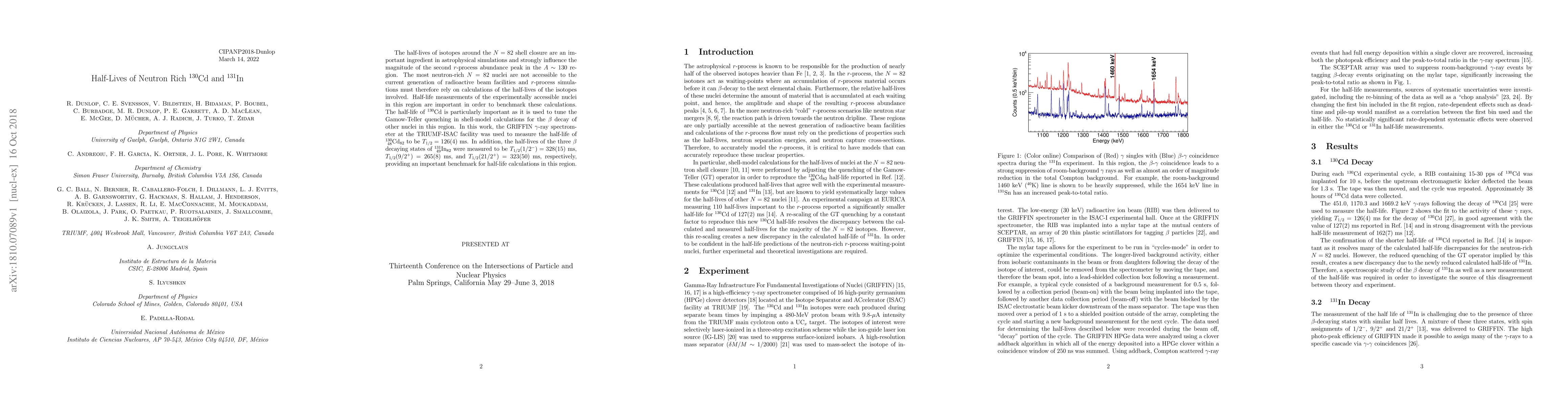 This research measures the half-lives of neutron-rich isotopes $^{130}$Cd and $^{131}$In using the GRIFFIN $gamma$-ray spectrometer at TRIUMF-ISAC. The half-life of $^{130}$Cd was found to be 126(4) ms, and the half-lives of three states in $^{131}$In were measured as 328(15) ms, 265(8) ms, and 323(50) ms, respectively. These findings serve as crucial benchmarks for astrophysical simulations and r-process abundance peak calculations.