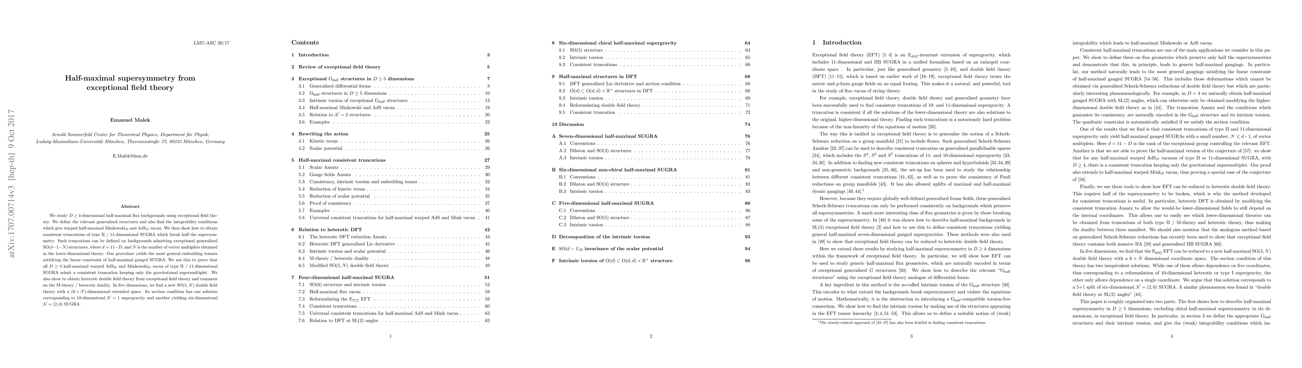 We study $D \geq 4$-dimensional half-maximal flux backgrounds using exceptional field theory. We define the relevant generalised structures and also find the integrability conditions which give warped half-maximal $\mathrm{Minkowski}_D$ and $\mathrm{AdS}_D$ vacua. We then show how to obtain consistent truncations of type II / 11-dimensional SUGRA which break half the supersymmetry. Such truncations can be defined on backgrounds admitting exceptional generalised $\mathrm{SO}(d-1-N)$ structures, where $d = 11 - D$, and $N$ is the number of vector multiplets obtained in the lower-dimensional theory. Our procedure yields the most general embedding tensors satisfying the linear constraint of half-maximal gauged SUGRA. We use this to prove that all $D\geq 4$ half-maximal warped $\mathrm{AdS}_D$ and Minkowski$_D$ vacua of type II / 11-dimensional SUGRA admit a consistent truncation keeping only the gravitational supermultiplet. We also show to obtain heterotic double field theory from exceptional field theory and comment on the M-theory / heterotic duality. In five dimensions, we find a new $\mathrm{SO}(5,N)$ double field theory with a $(6+N)$-dimensional extended space. Its section condition has one solution corresponding to 10-dimensional ${\cal N}=1$ supergravity and another yielding six-dimensional ${\cal N}=\left(2,0\right)$ SUGRA.